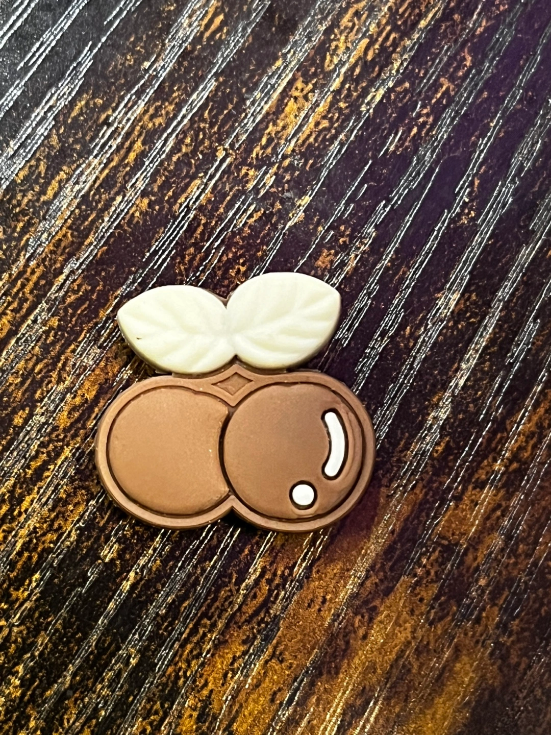Features a charming fruit design, with a light-colored element on top, and a cute smile on one part. This adorable charm would be a sweet addition to anyone's collection.
