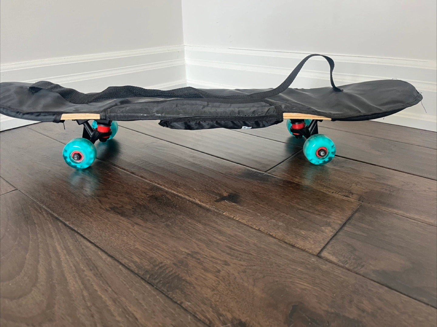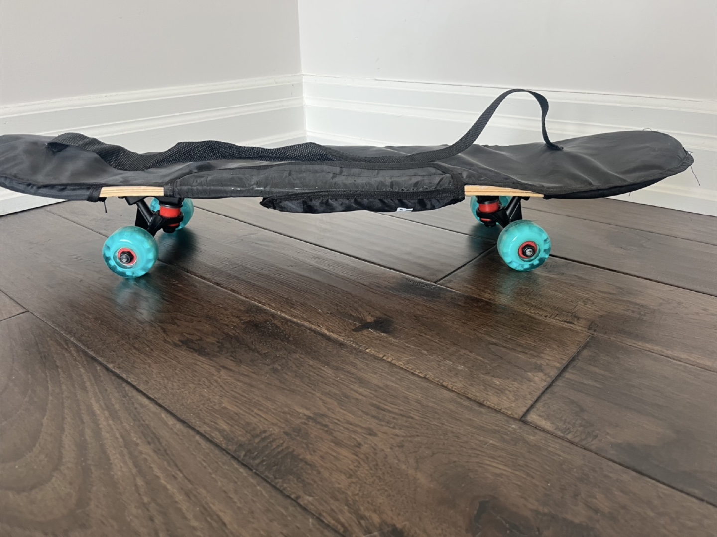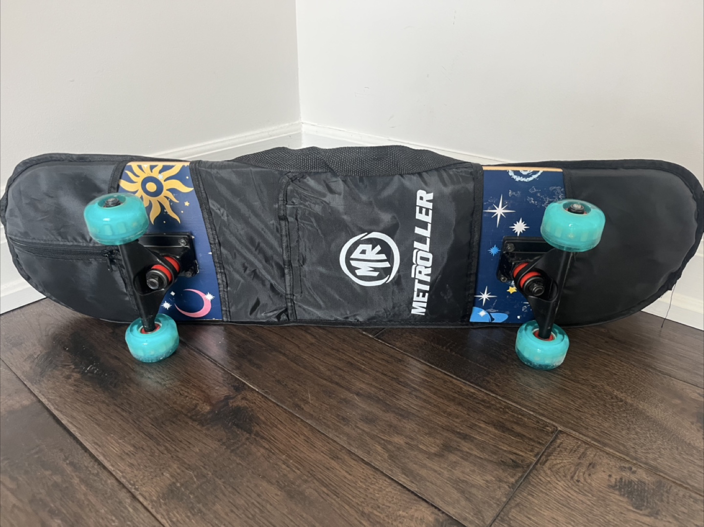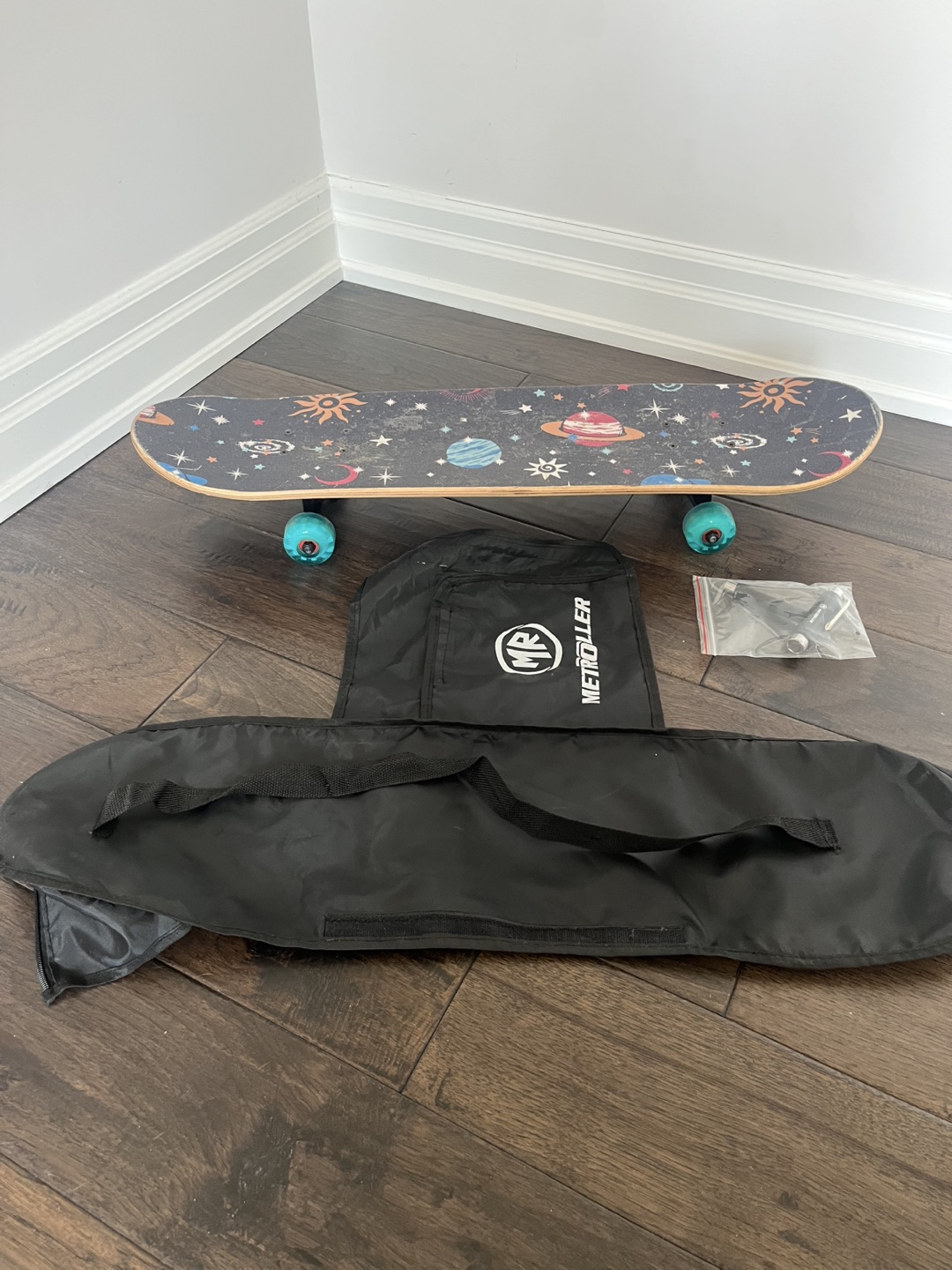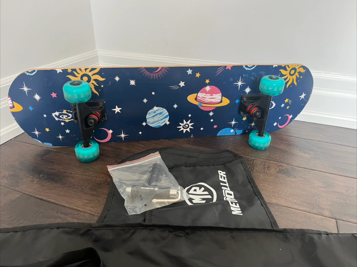 A colorful skateboard with a cosmic design on the deck. The board has teal wheels and black hardware. It includes a black carrying case and some tools. I hope this board brings you endless joy.