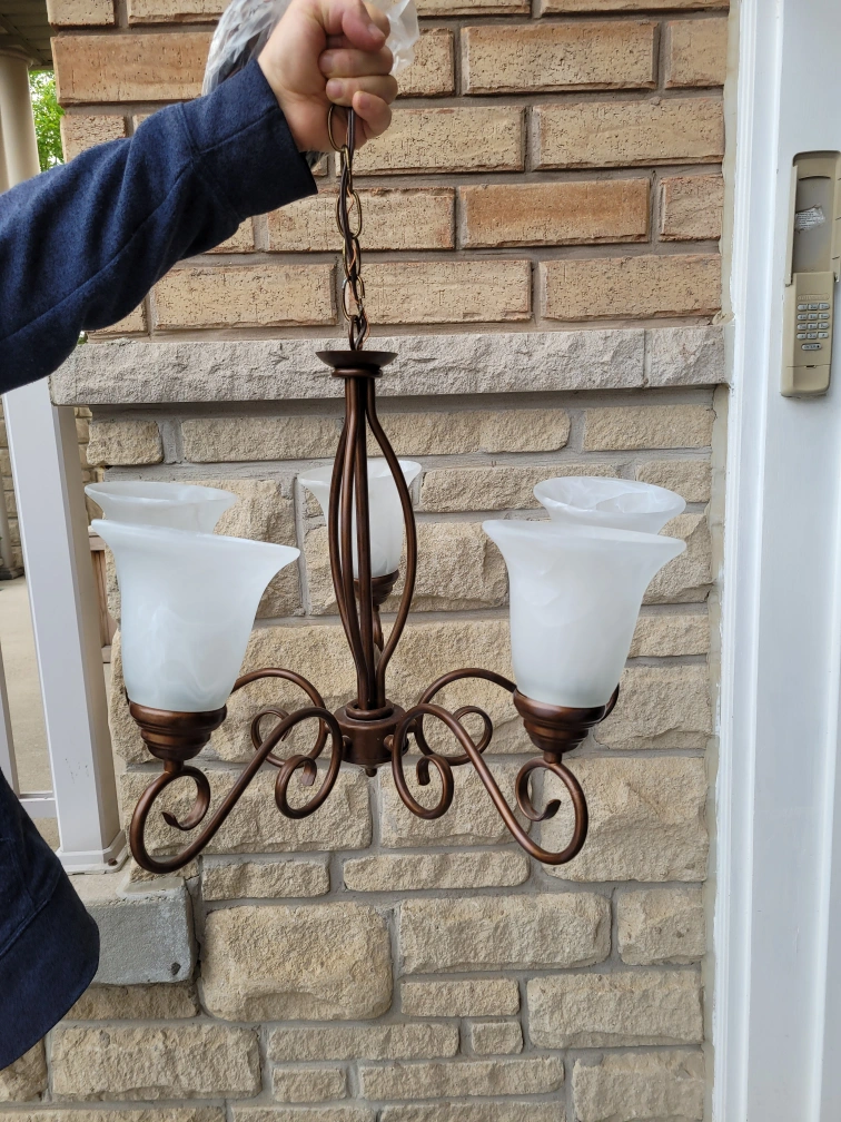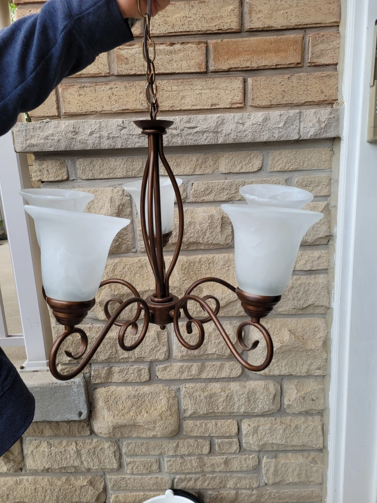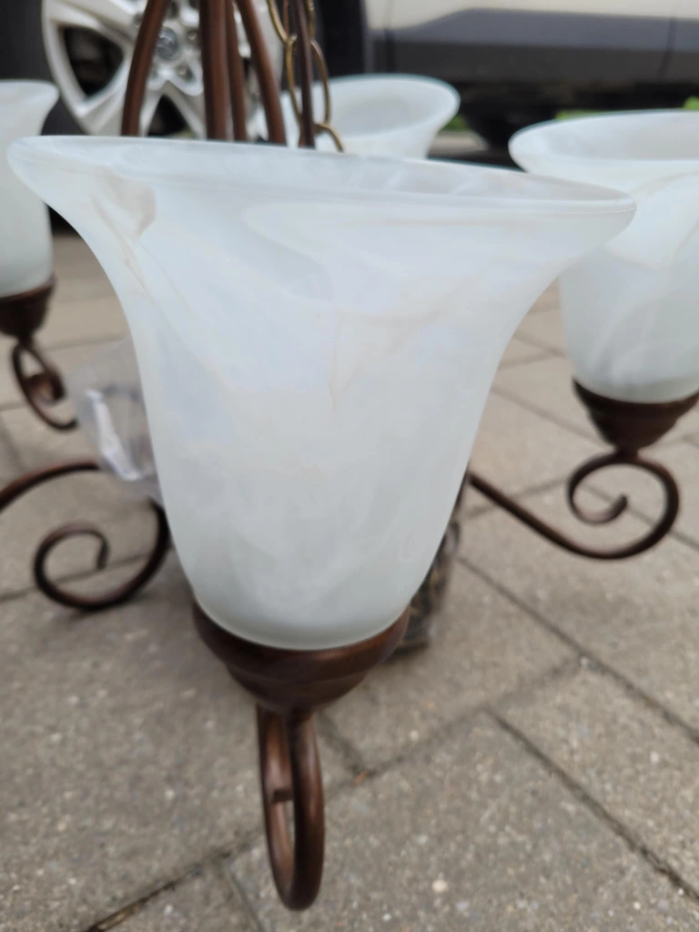 I'm selling a used chandelier featuring a bronze finish and five frosted glass shades, perfect for adding a touch of elegance to any dining room or living space. This item has been previously installed and enjoyed, but is still in good working condition.