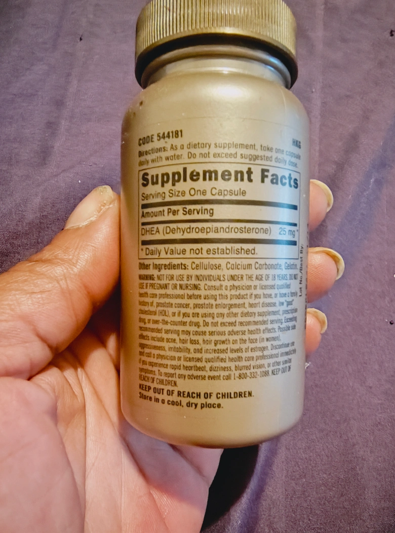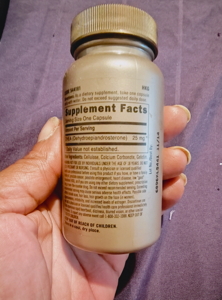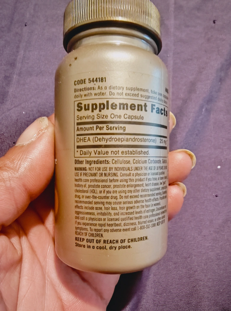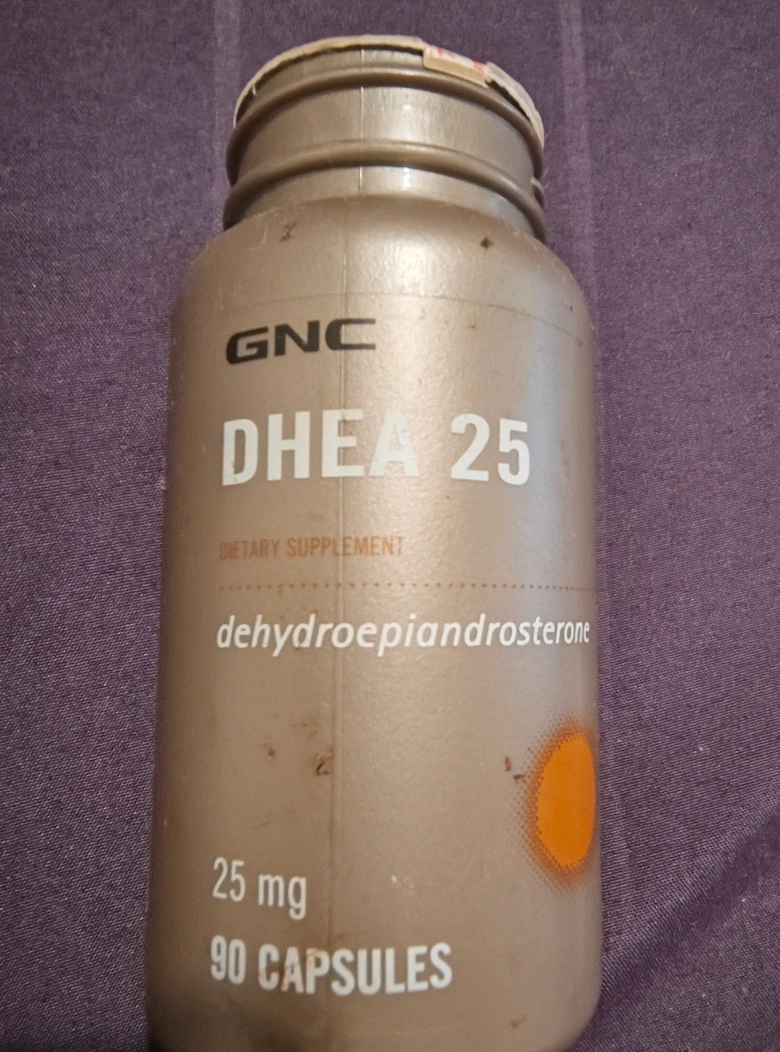 DHEA 25 CAPSULES FOR MEN USED 50 CAPSULES EXP 11/14 A supplement in a tan-colored bottle. A label is displayed with white writing. Information about the product is also listed. Take the supplement as directed to get a boost in your day, and feel confident in your choices.
