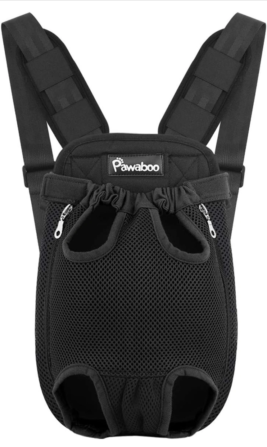 A handy carrier to take your small pet with you. Made of black fabric with mesh and zippers. It features adjustable straps and a hook and loop closure.