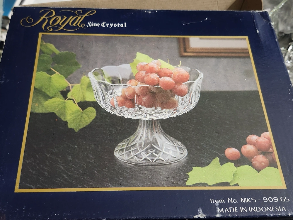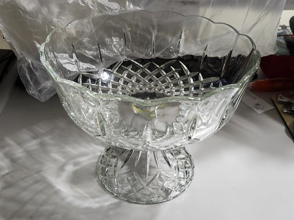 A beautiful clear crystal footed bowl with a scalloped rim. The base is round, with diamond cuts. The bowl is also adorned with diamond cuts. This would be a lovely piece to display your favourite fruits in.