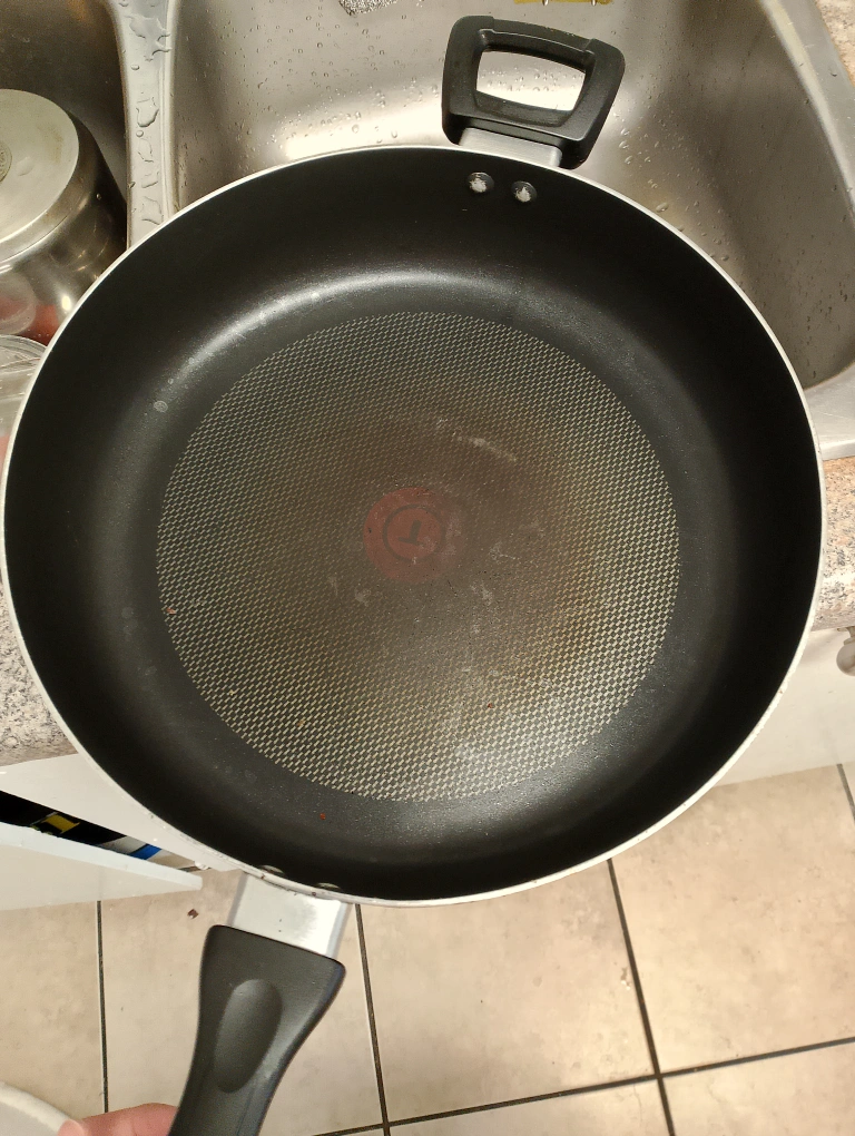 A large frying pan with a matching lid. Features a long handle for easy use. Could be perfect for making a comforting dinner after a long day.
