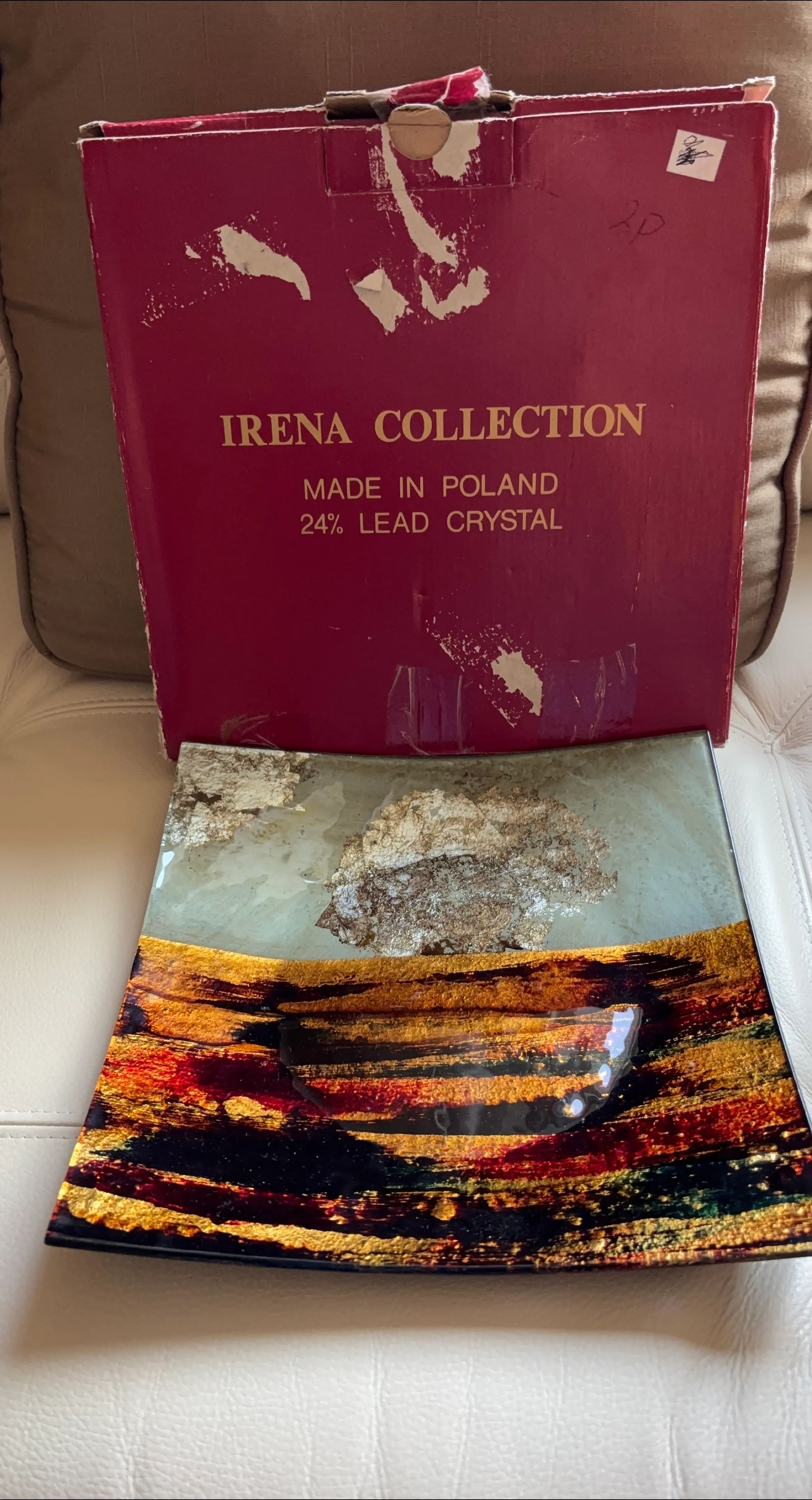 Gorgeous decorative dish, 24% lead crystal. About 11 inches x 11 inches, curves slightly at the edges. Made in Poland. Comes with box that is a little beat up.