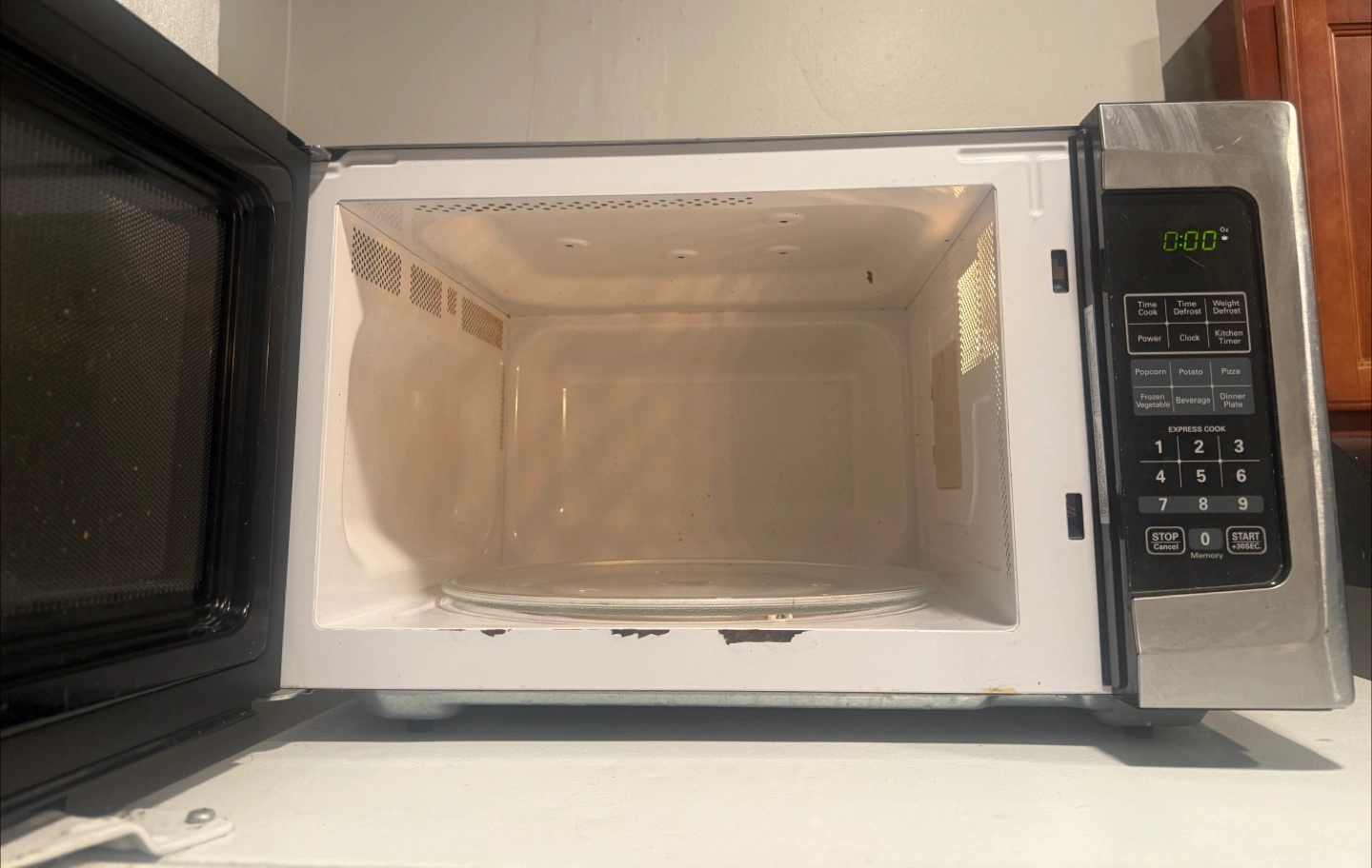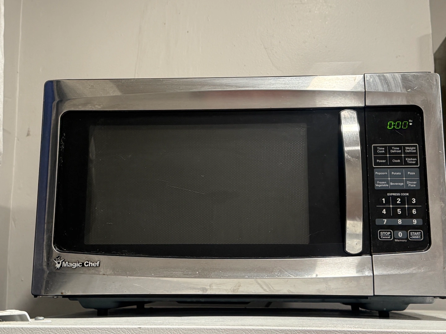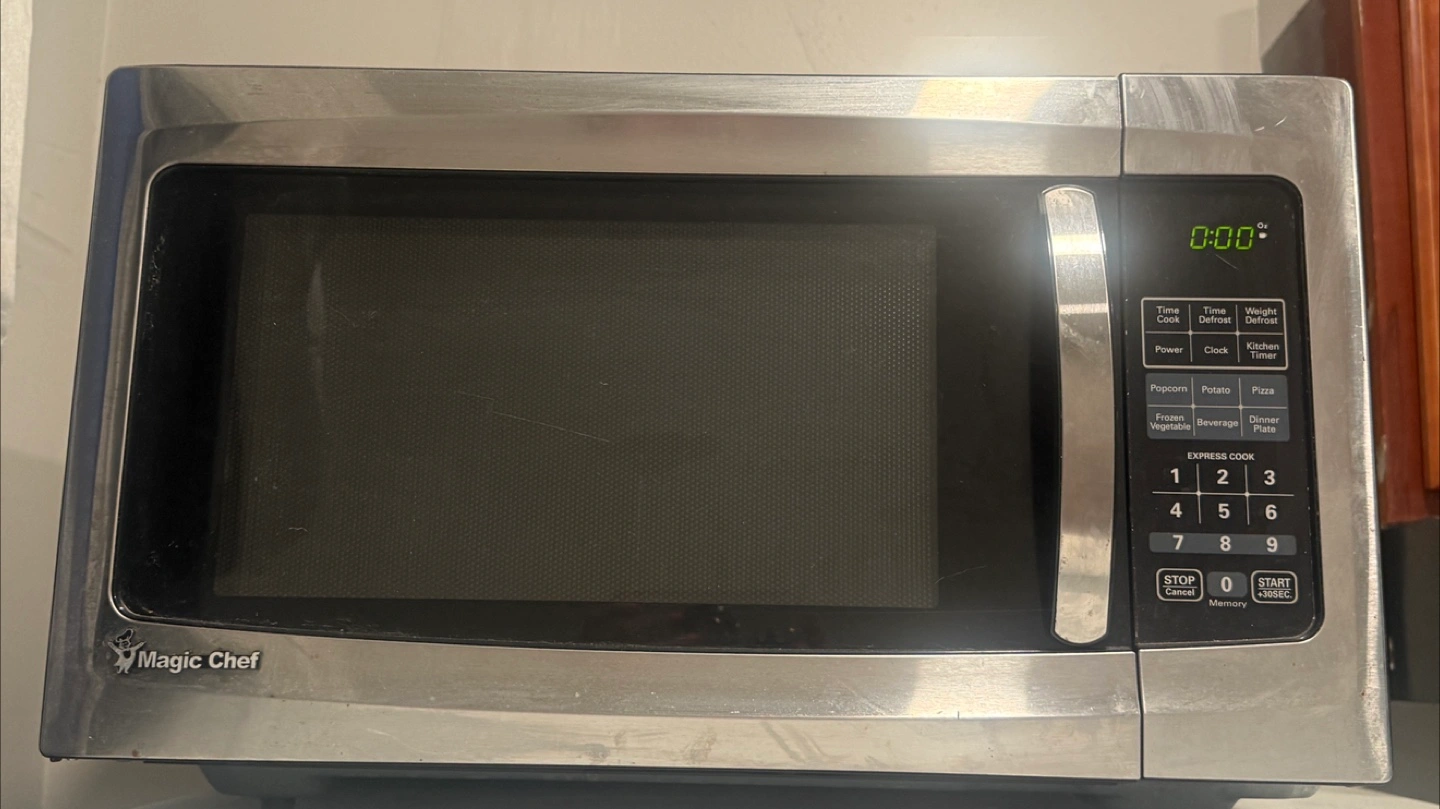 Silver-colored microwave with a digital display. Features a variety of cooking presets. It can be the perfect appliance for effortlessly heating up your meal.
