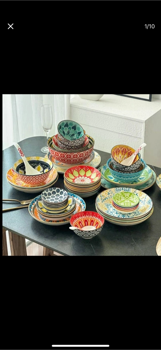70Plates and bowls of various sizes, with vibrant colors and intricate patterns. I imagine these dishes will enhance the enjoyment of your next meal.