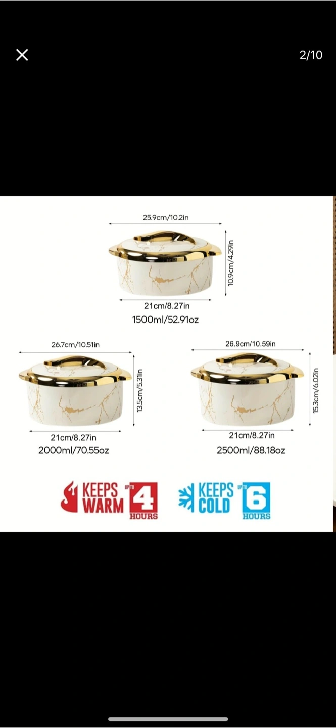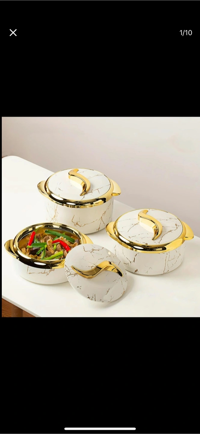 Beautiful food warmer set. Three pieces with lids and gold accents. Perfect for hosting and keeping your meals warm. You can relax and know your guests will be well taken care of.