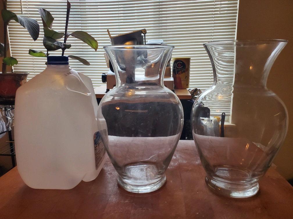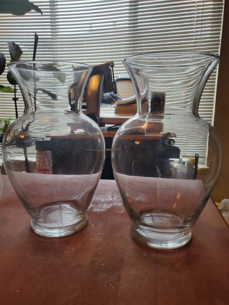 Two glass vases for floral arrangements. Simple shapes, with a wider bottom. You can create a lovely atmosphere by displaying flowers in these vases.( 1 gallon milk jug for effect)