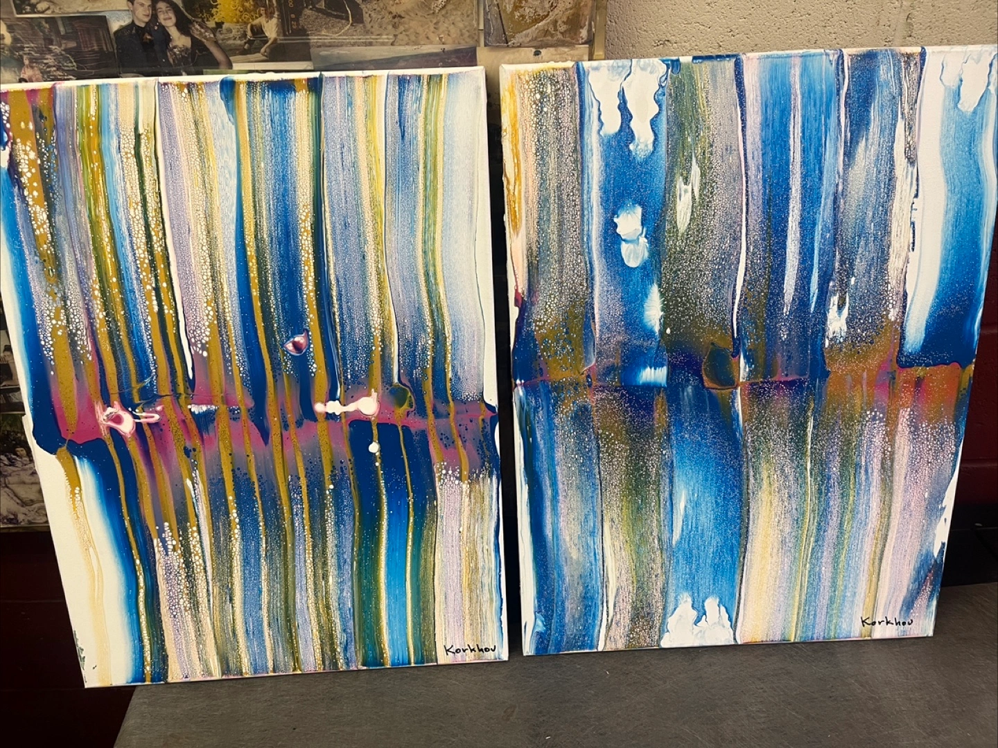 A pair of abstract art pieces. Featuring flowing colors on a textured surface. They might look amazing in a meditation room to promote a sense of peace and tranquility.
