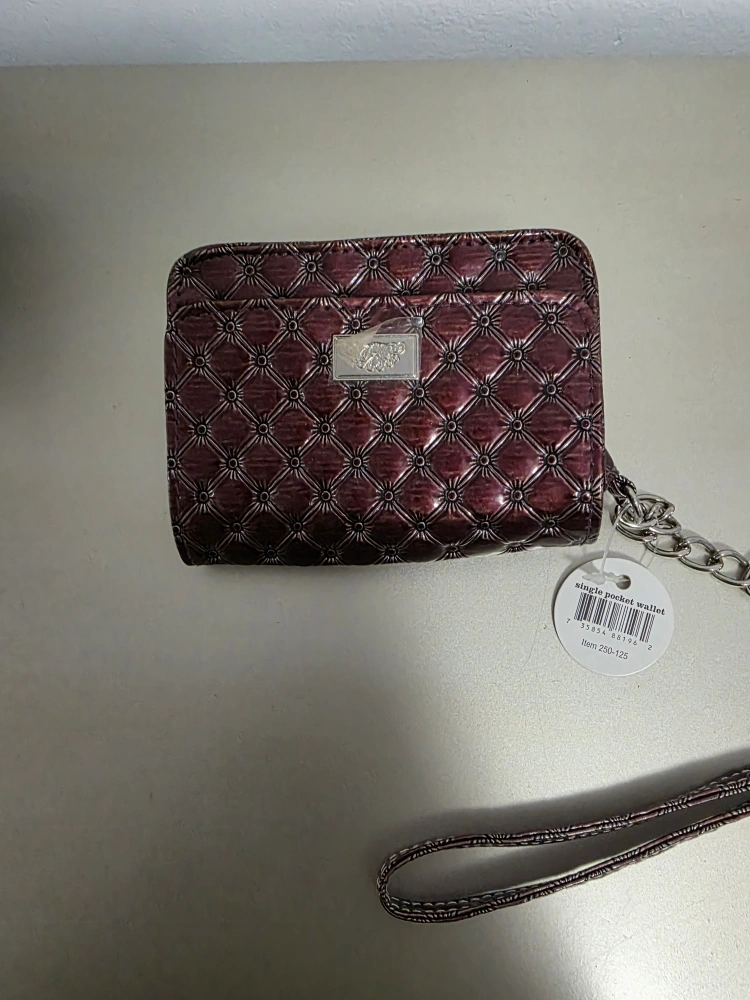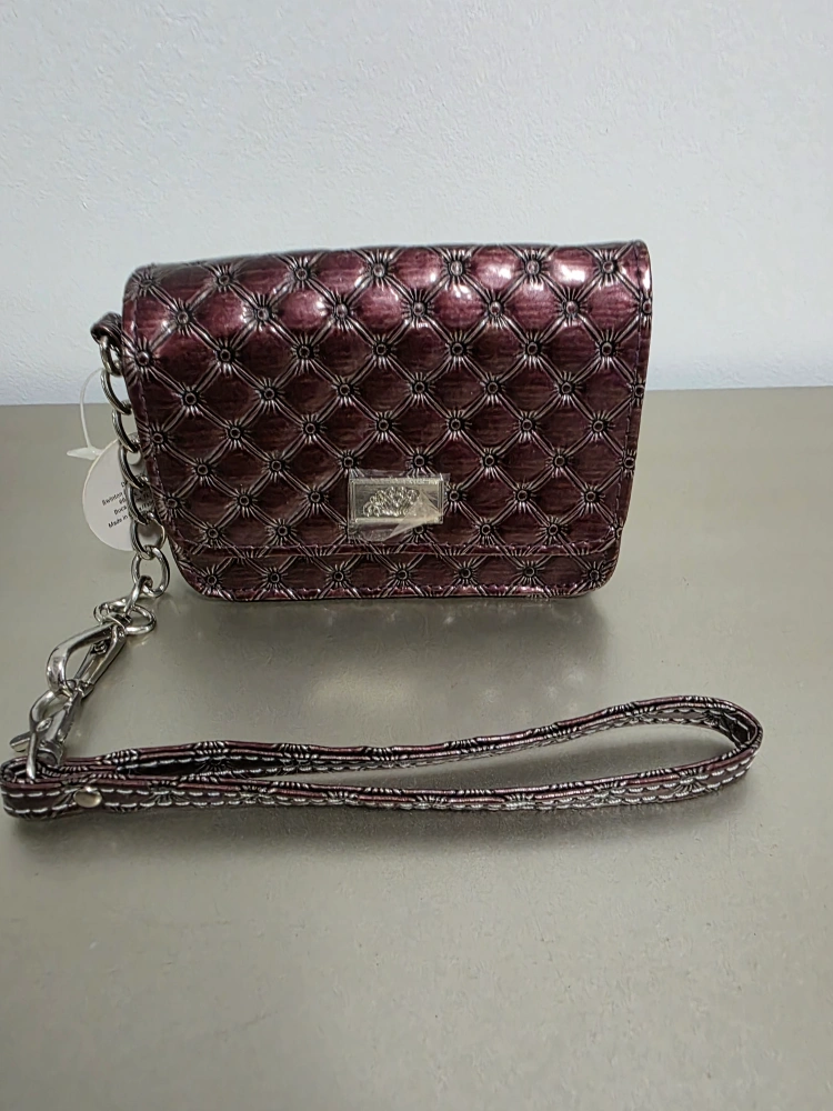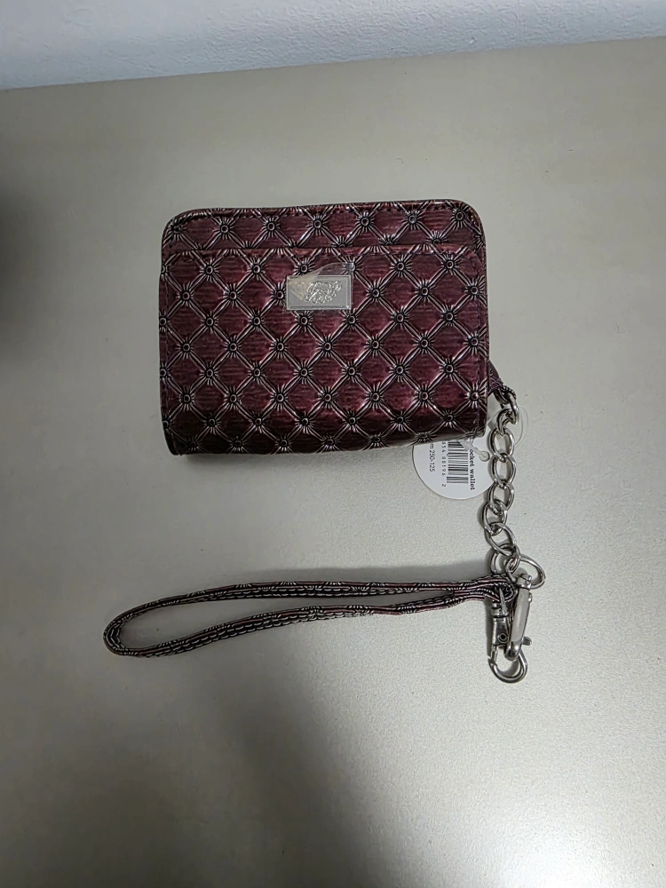 A burgundy-coloured wristlet. It is quilted. Featuring a chain and a wrist strap. This wallet can be great to bring when you are out shopping.