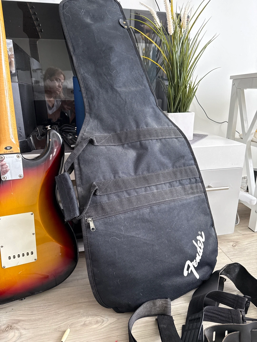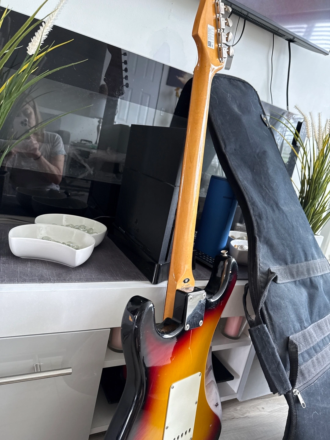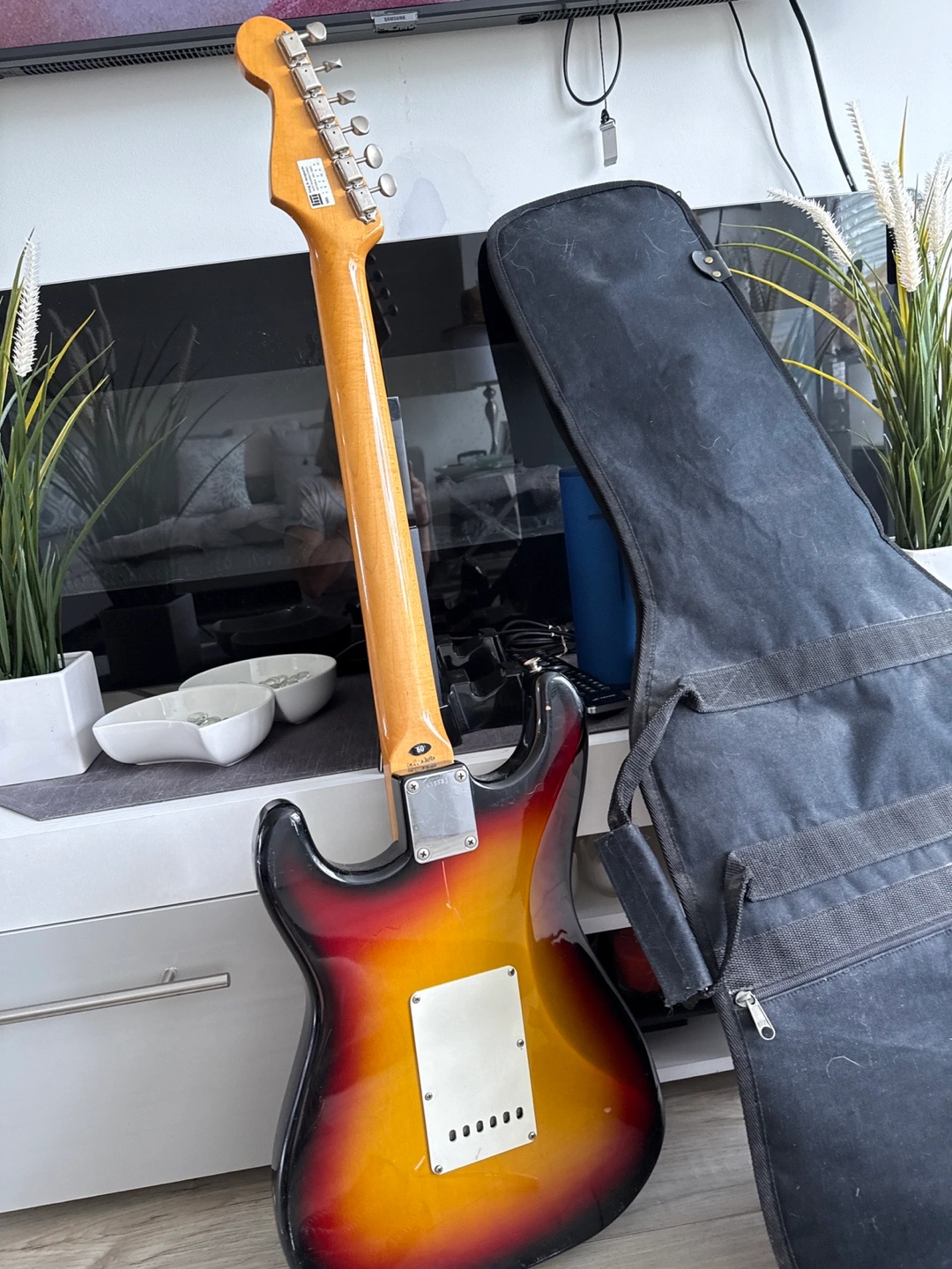 A beautiful electric guitar. Appears to be a vintage instrument, with a classic sunburst finish. The neck is visible, and the headstock features tuning pegs. Comes with a black case and guitar strap. I would like to offer you a calming and enjoyable music experience. FIX PRICE. LOW BALLER will be ignore. Serious inquiry only. Pick up only Richmond.
