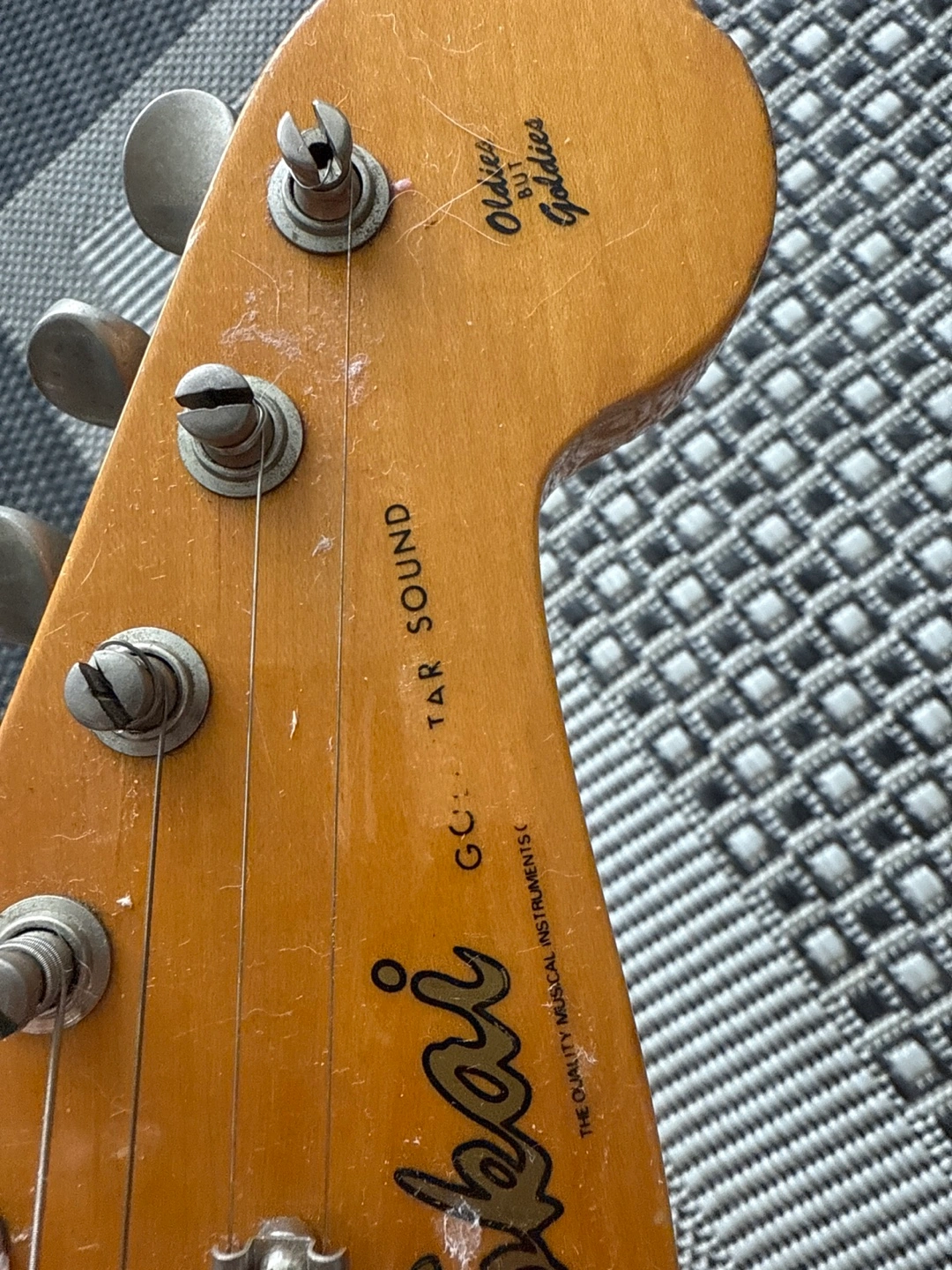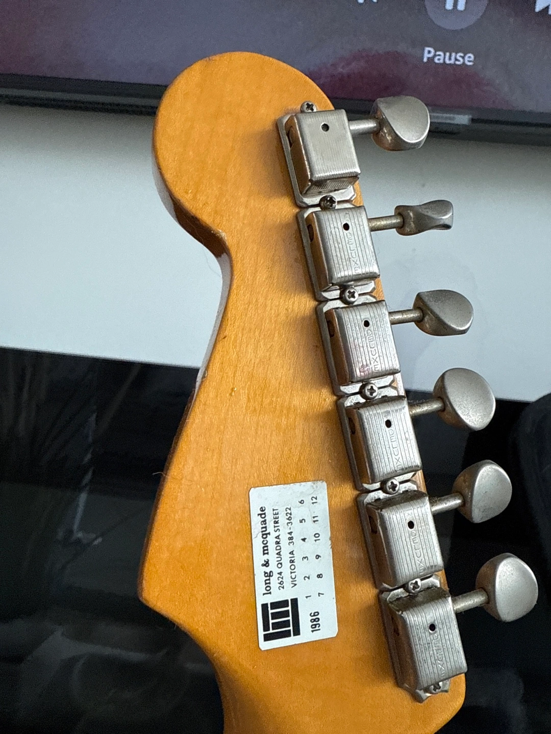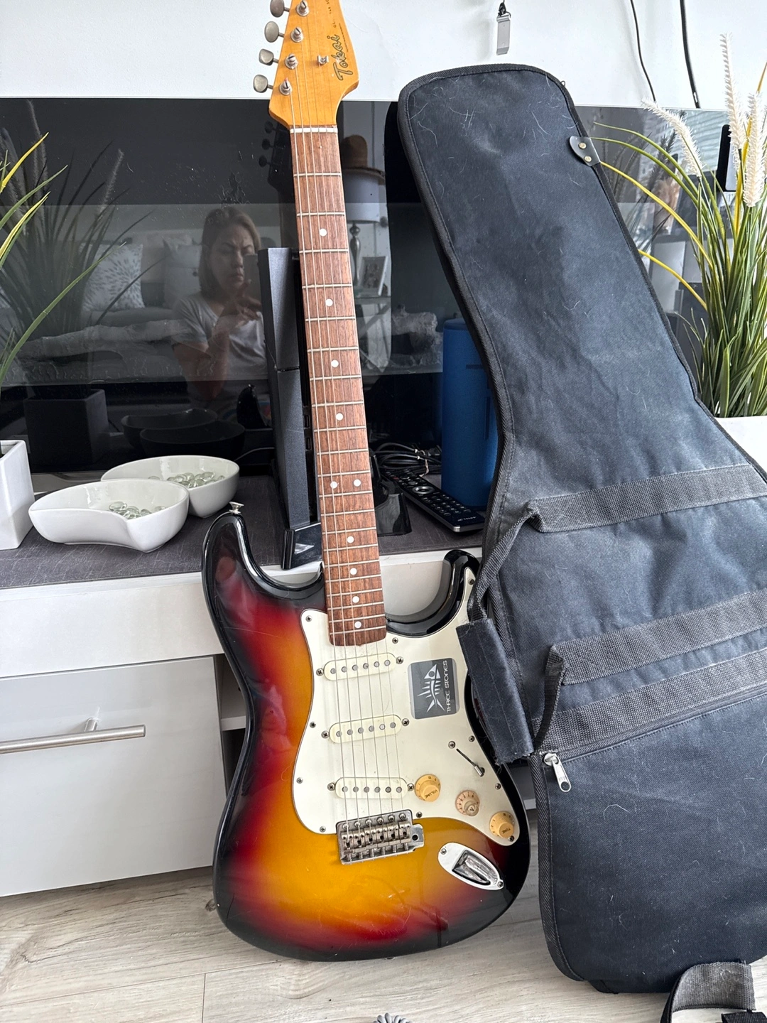 A beautiful electric guitar. Appears to be a vintage instrument, with a classic sunburst finish. The neck is visible, and the headstock features tuning pegs. Comes with a black case and guitar strap. I would like to offer you a calming and enjoyable music experience. FIX PRICE. LOW BALLER will be ignore. Serious inquiry only. Pick up only Richmond.