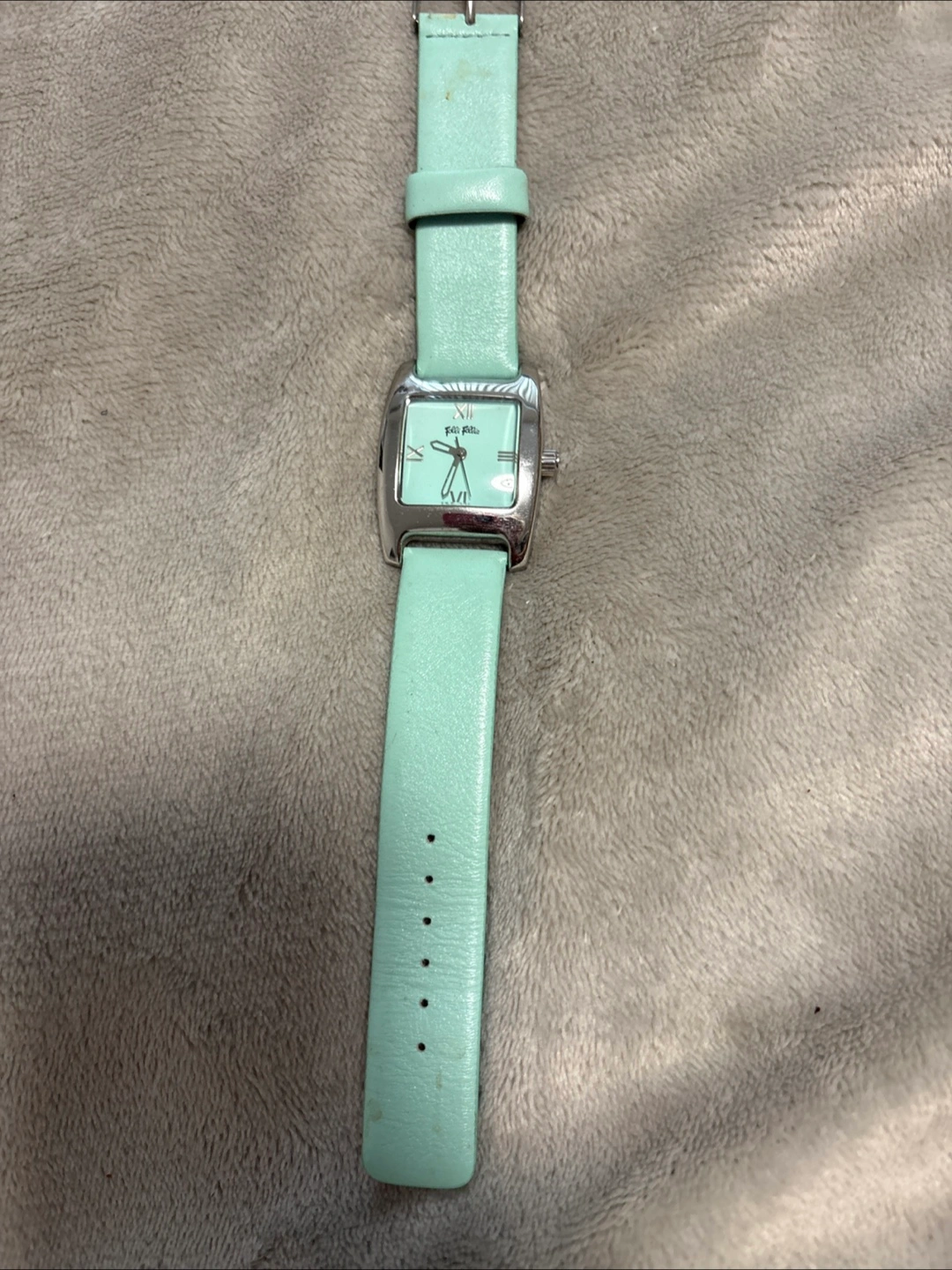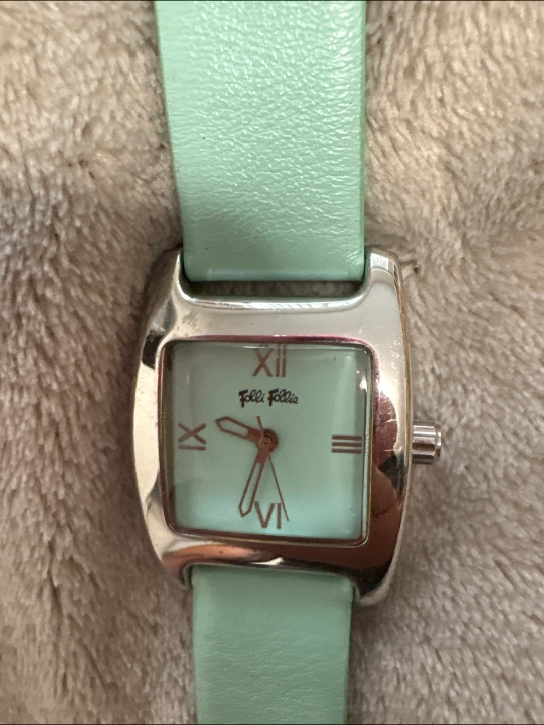 A beautiful watch. Featuring a square face with Roman numerals. Comes with a mint green strap. A great item to help you keep track of the time while enjoying the day.