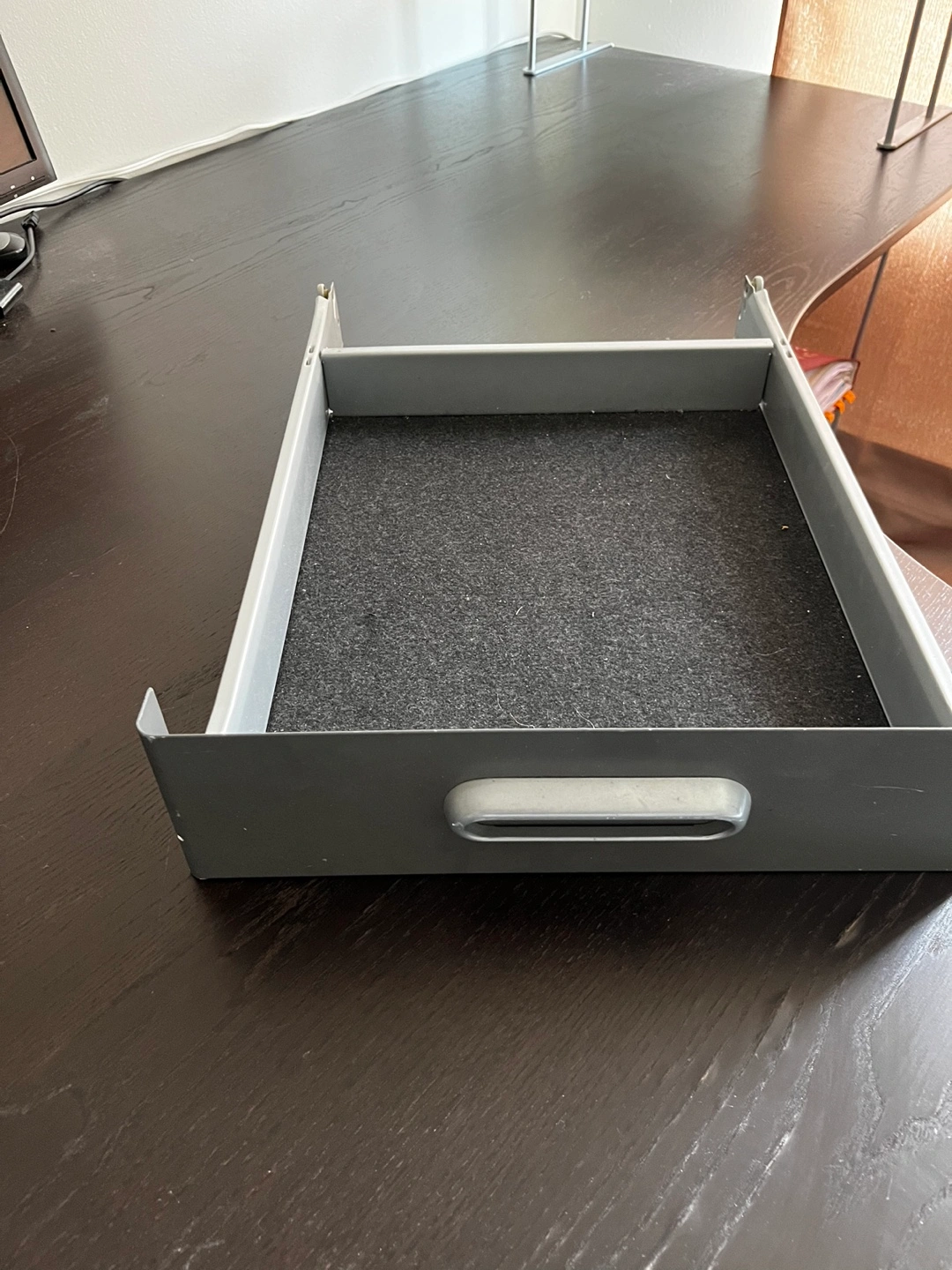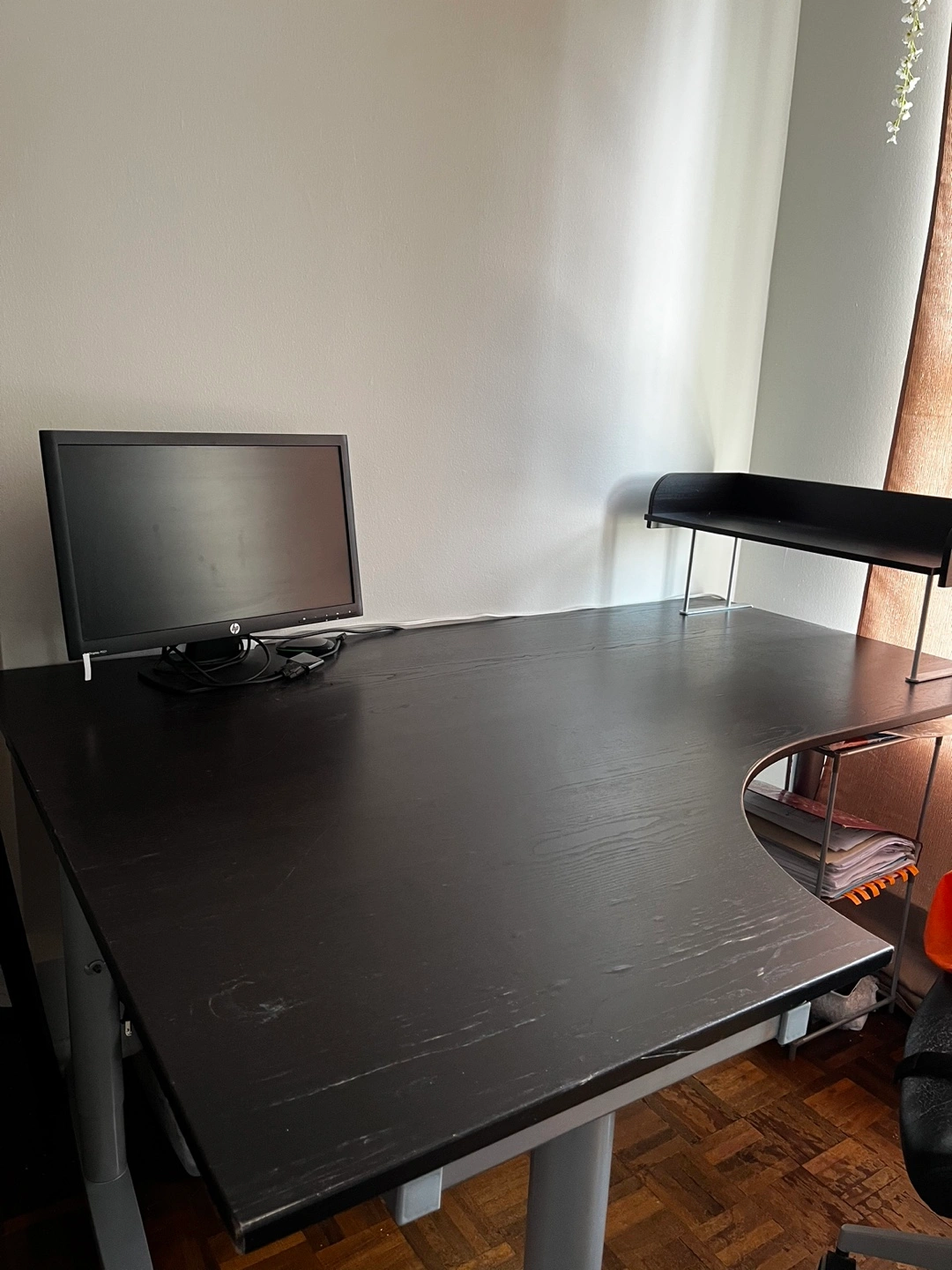 A stylish black L-shaped desk. Includes an additional shelf. A drawer is included. This desk could be a great place to start your work day.