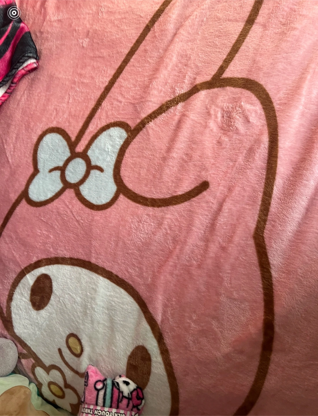 Pink blanket with character design. Brown outlines and details. Soft material. Use it to relax and snuggle up after a long day.
