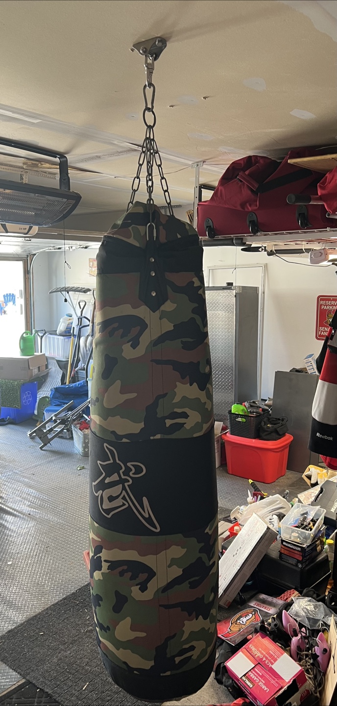 A camouflage coloured punching bag. It has a black midsection. Its hanging chain is connected at the top. It's a great way to relieve stress after a long day.