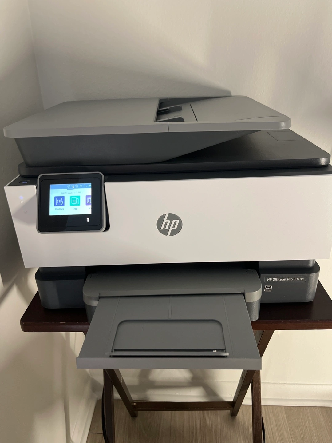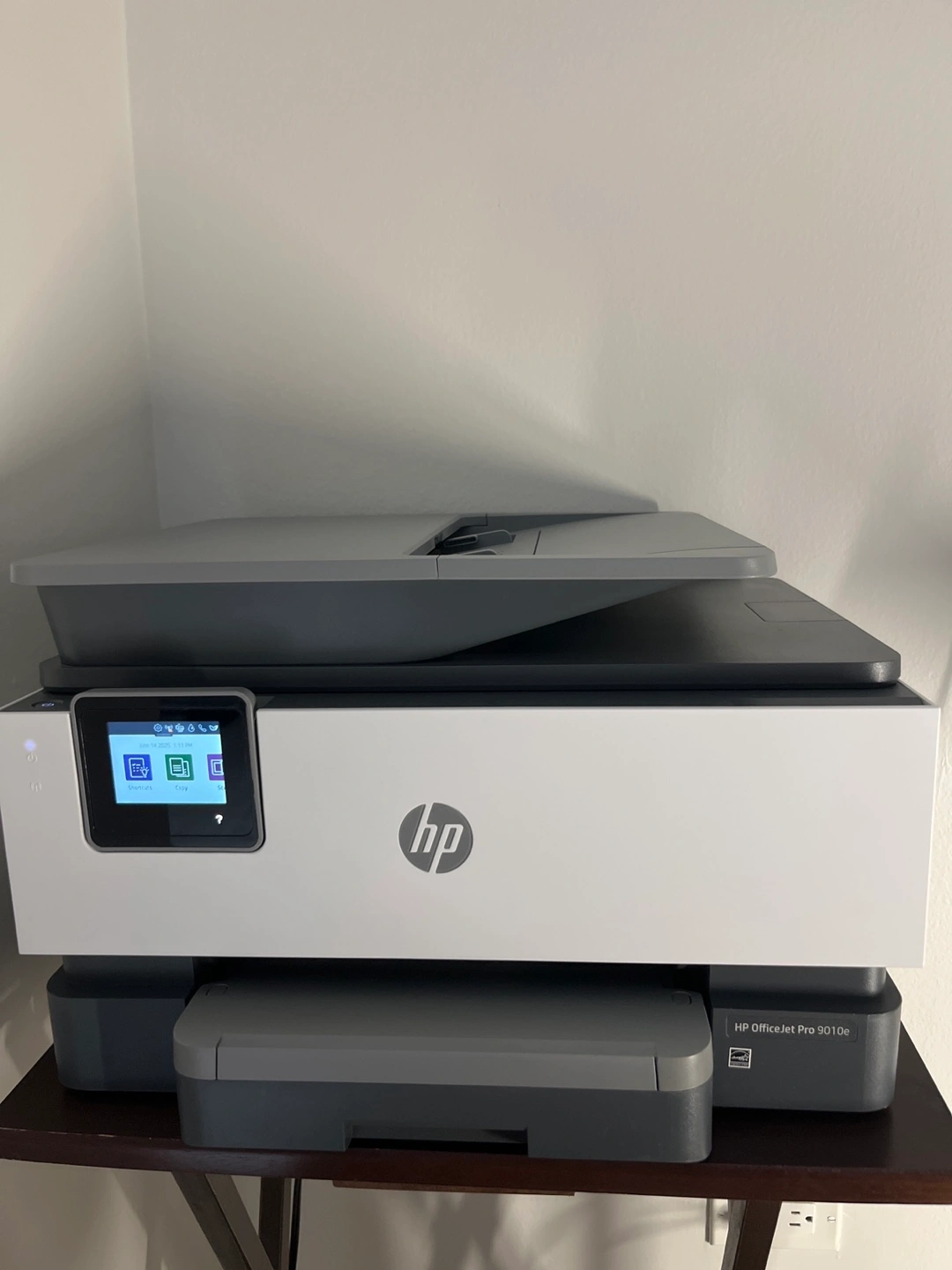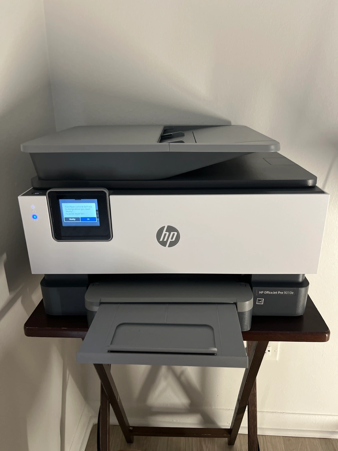 A white and gray printer. A front display screen. The printer is sitting on a wooden table. It's a great addition to any home office.