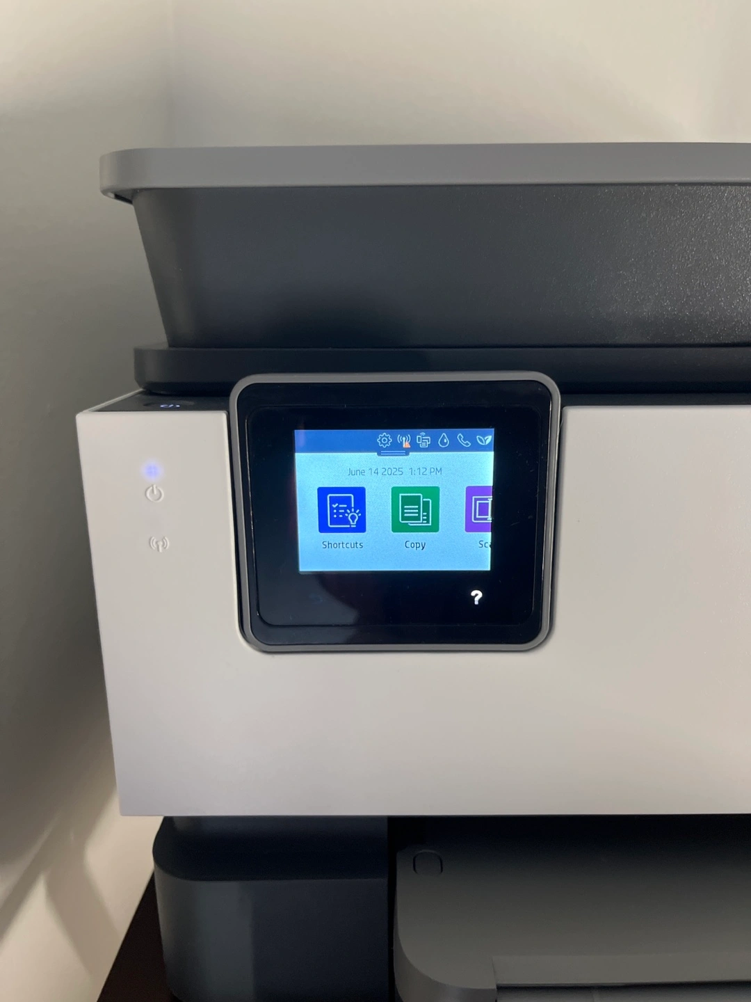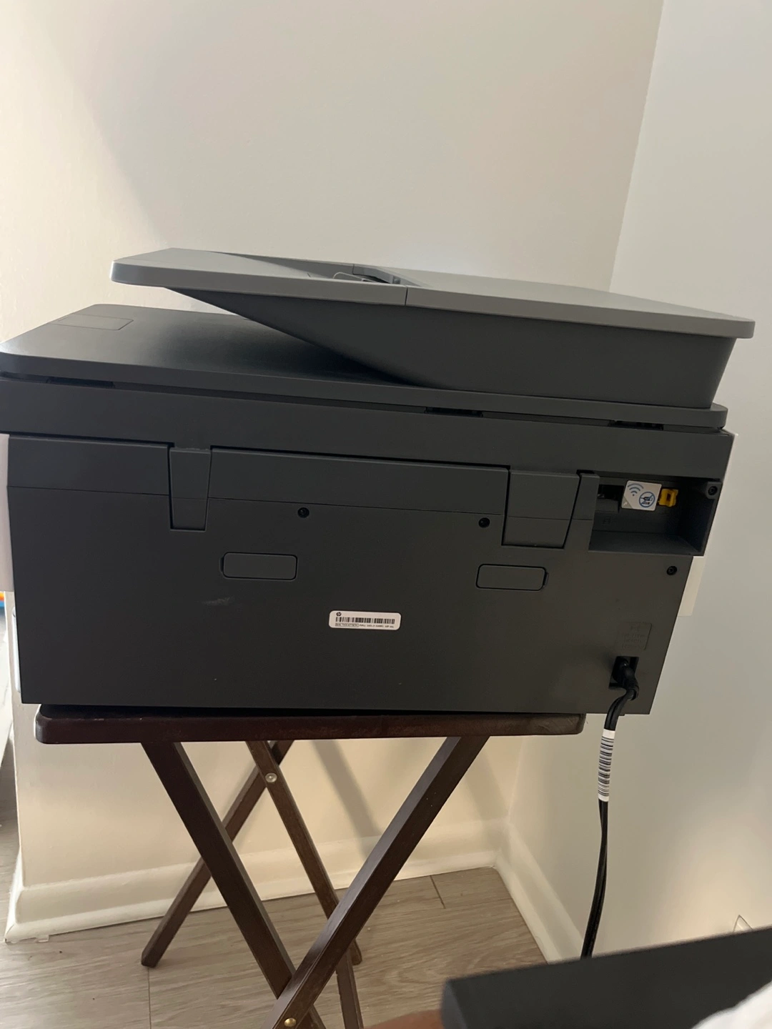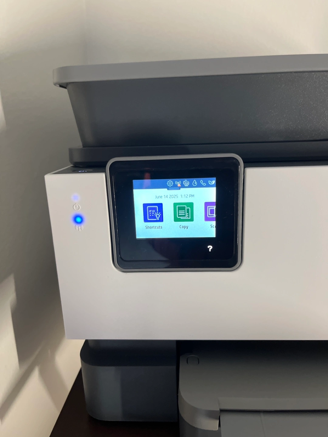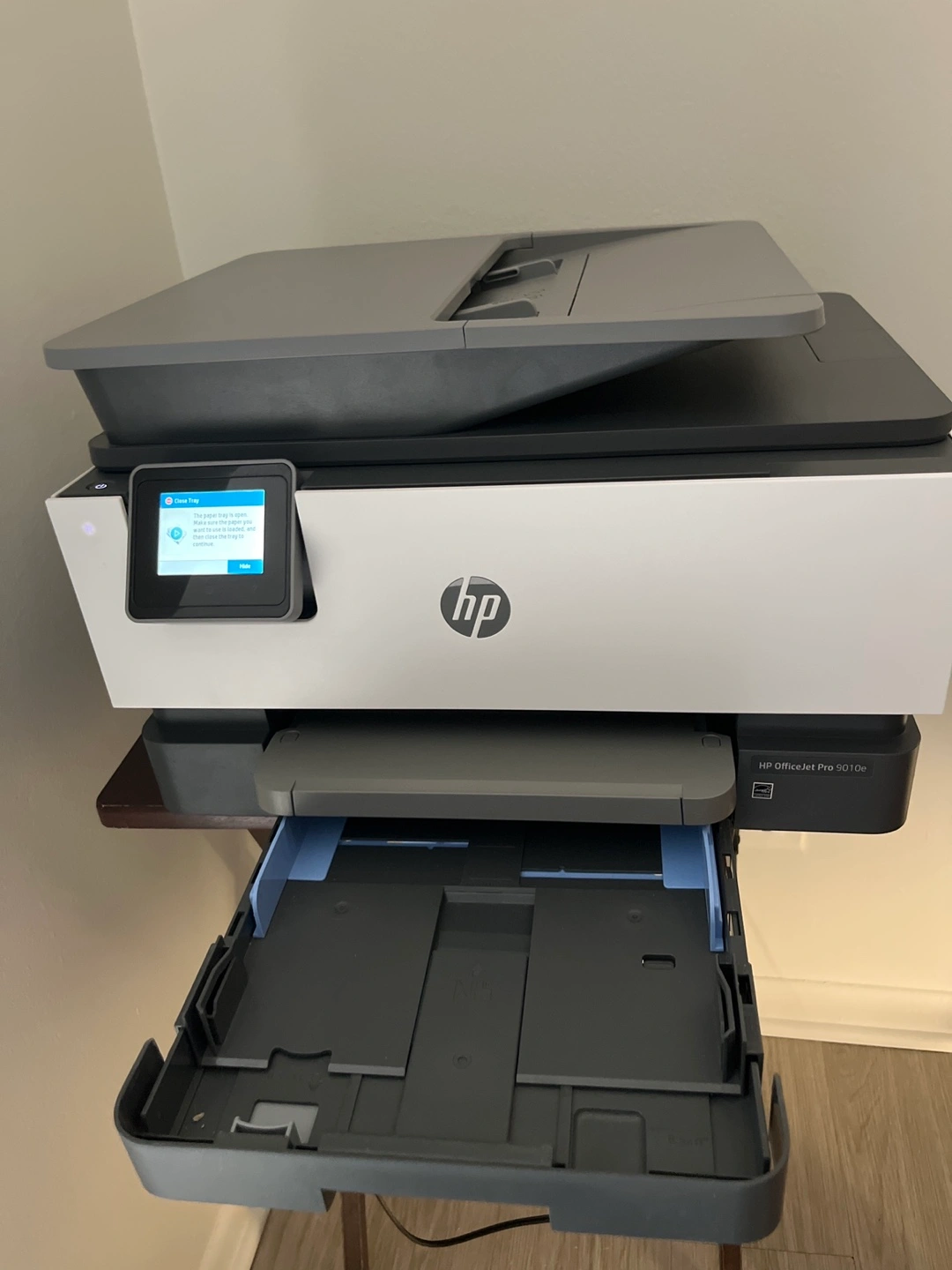 A white and gray printer. A front display screen. The printer is sitting on a wooden table. It's a great addition to any home office.