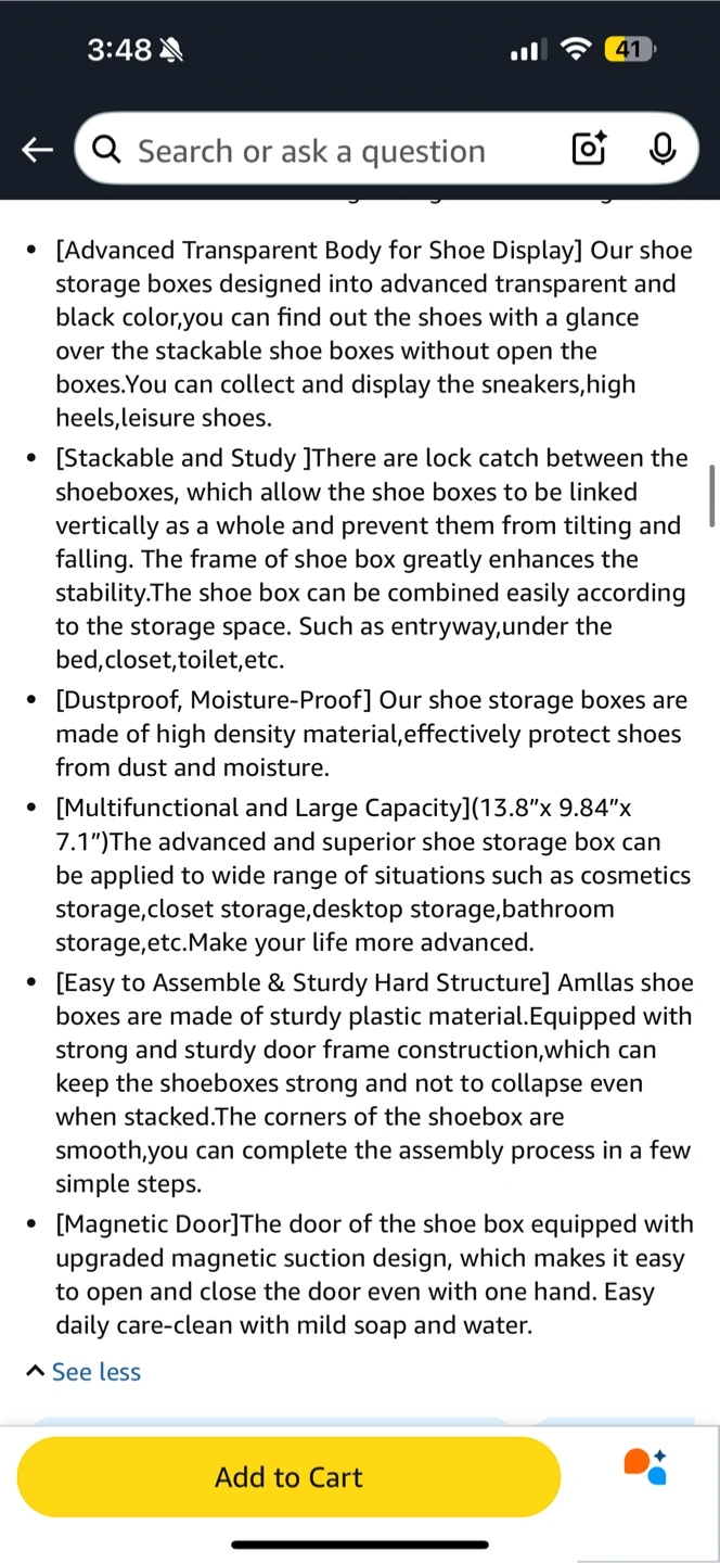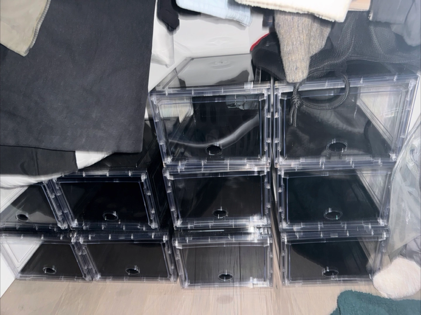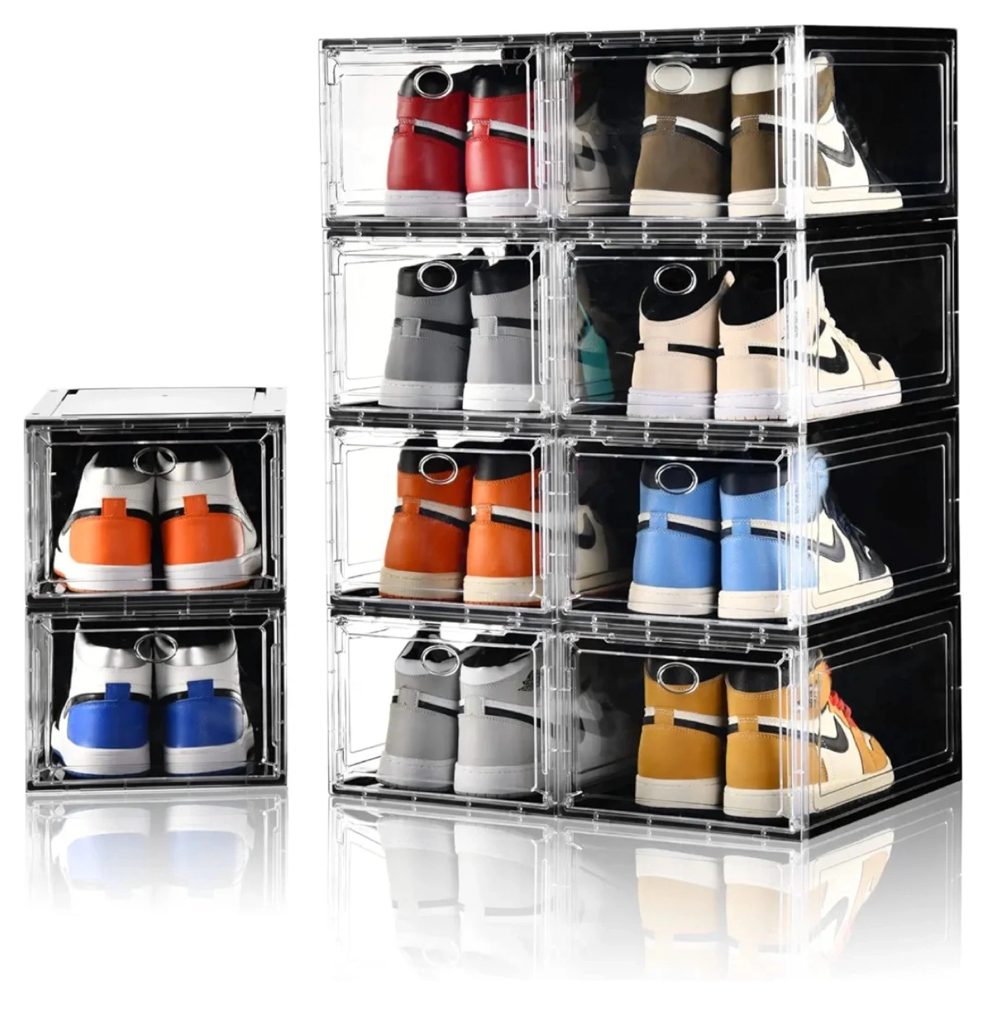 Clear plastic shoe storage boxes. Stackable design. Clear door for easy viewing of contents. Great for storing shoes while keeping them organized.