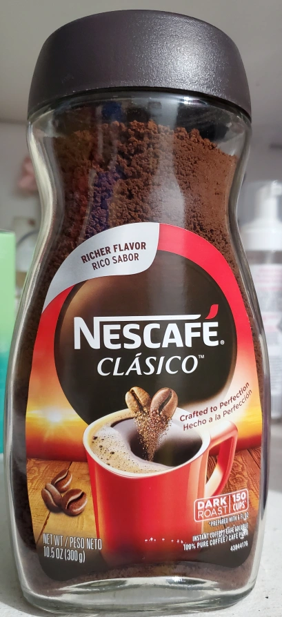 A jar filled with ground coffee. The jar is glass, with a dark brown lid. The label features a coffee cup with beans pouring into it. A perfect morning beverage to get you started.