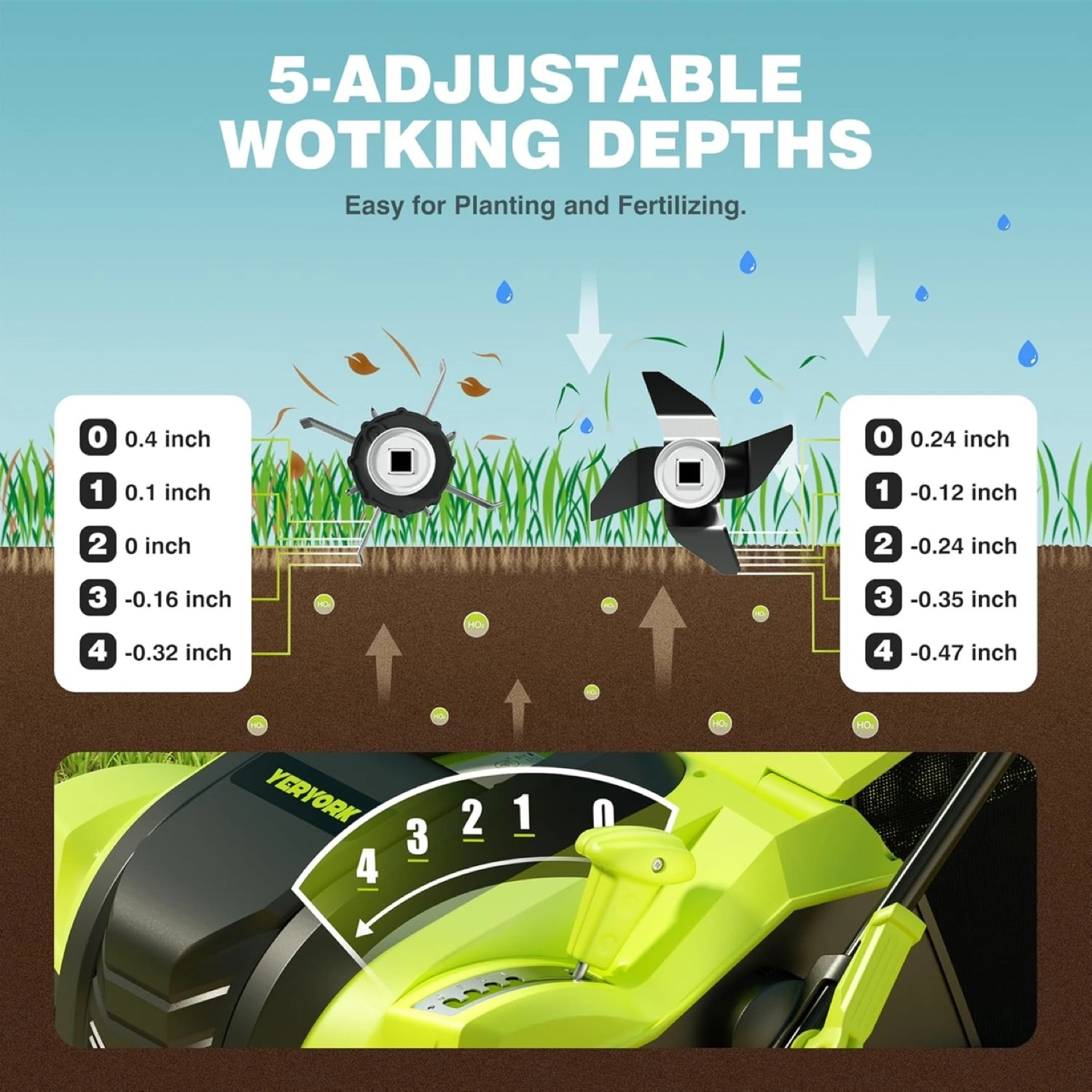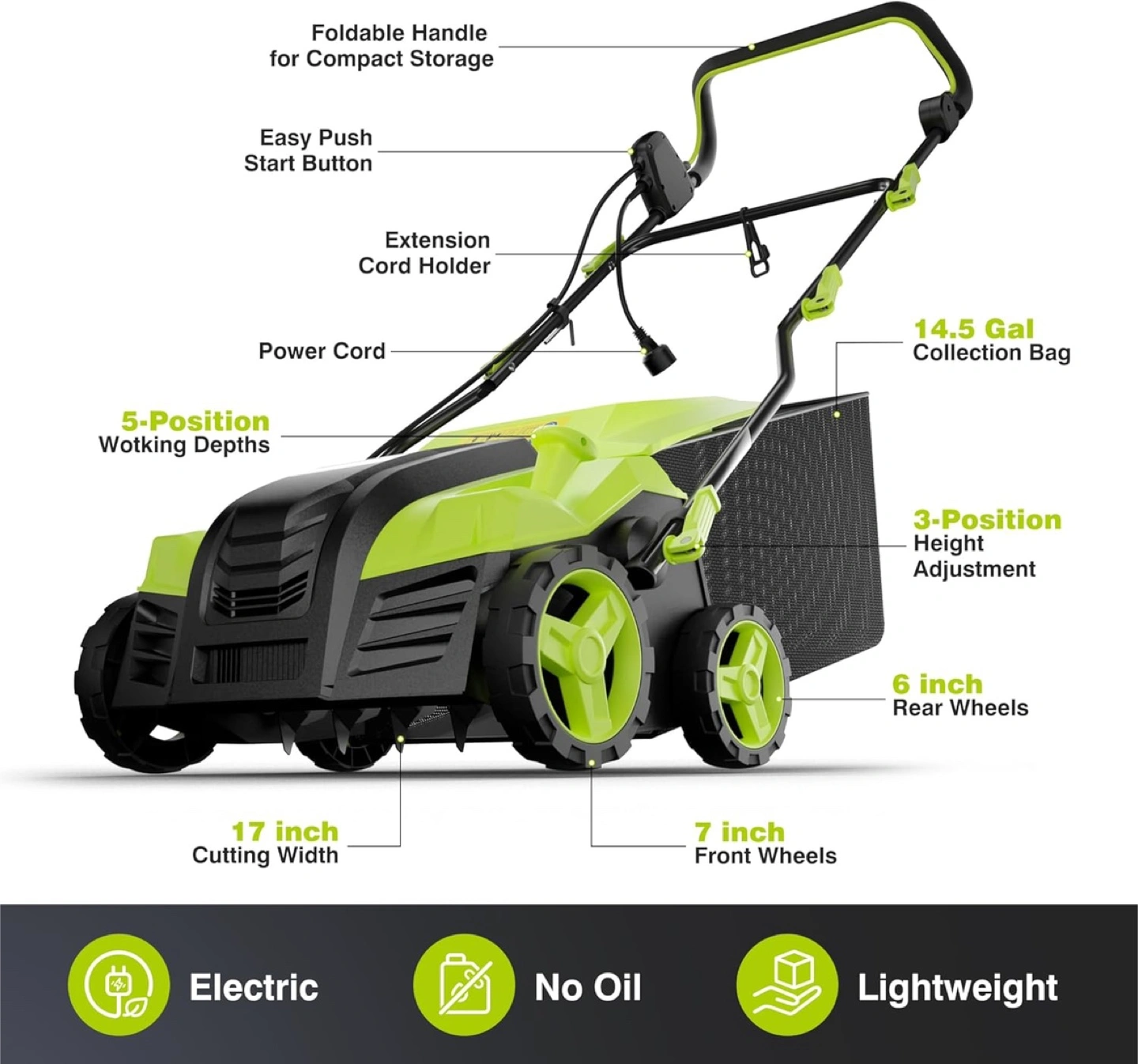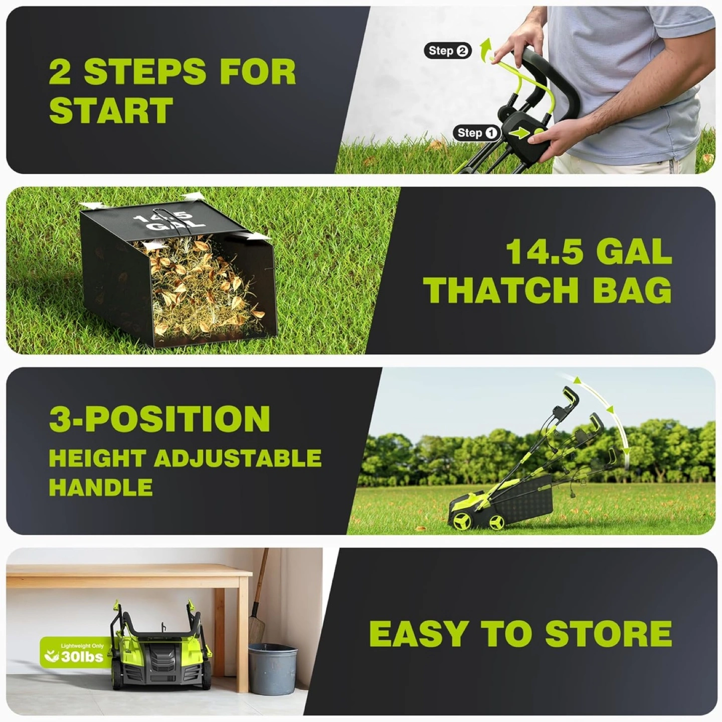 An easy to use lawn dethatcher with scarifier. Features a 2-in-1 function design and 5 adjustable working depths. Perfect for keeping your lawn pristine, and you'll have a great time maintaining it too.