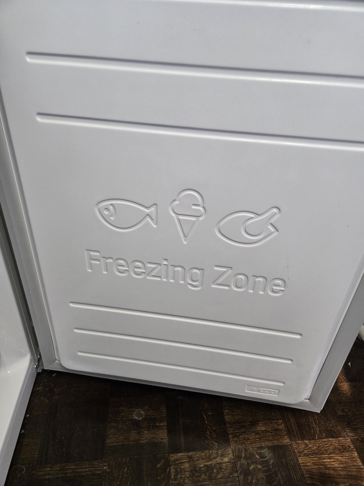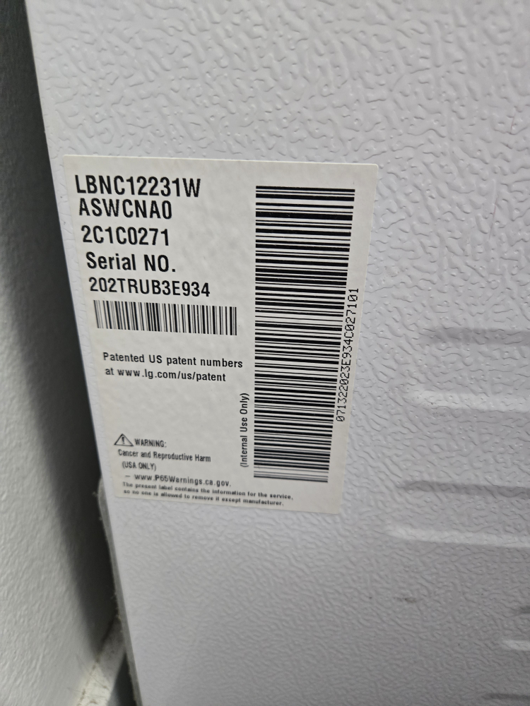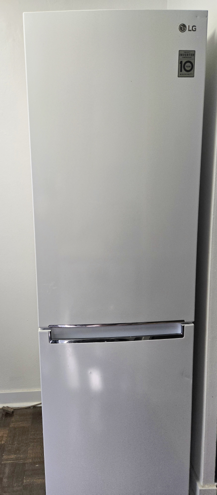 A white LG refrigerator, with a bottom freezer. In the main compartment it has Moist Balance Crisper drawer and Fresh Zone drawer for fruits and veggies as well as three shelves on the door for eggs and condiments.
