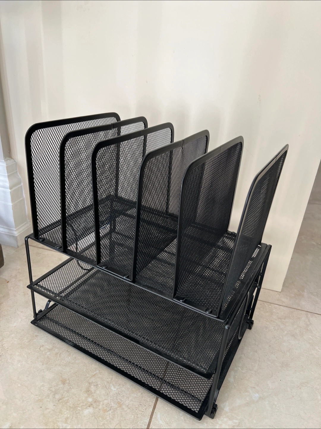 A black desk organizer. Contains a two-tier structure. The upper tier features four vertical compartments. The lower tier has two flat sections. You can use this organizer to create a stress-free and organized workspace.