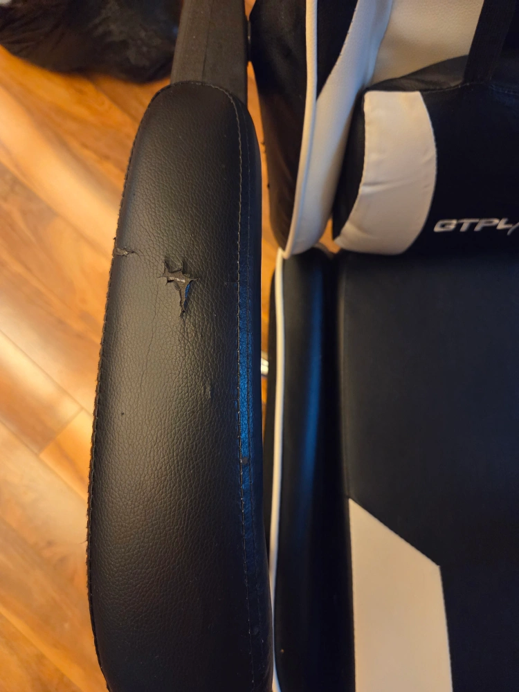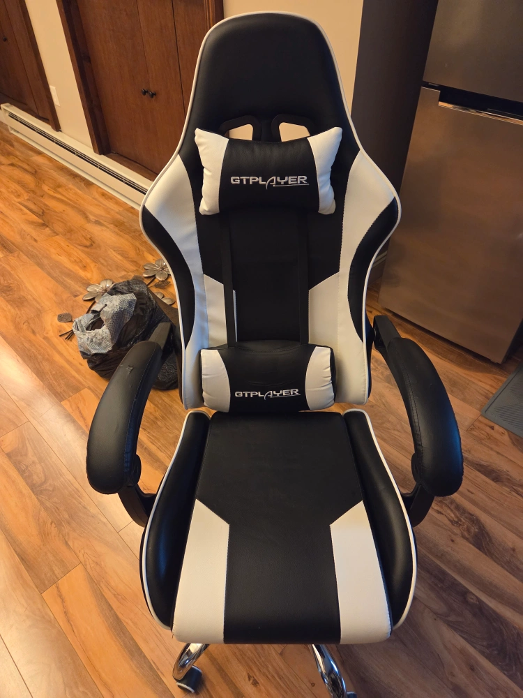 this gaming chair is good and comfortable just have a tear on the armrest. you can also put your legs with a piece that slides out from under the chair up.