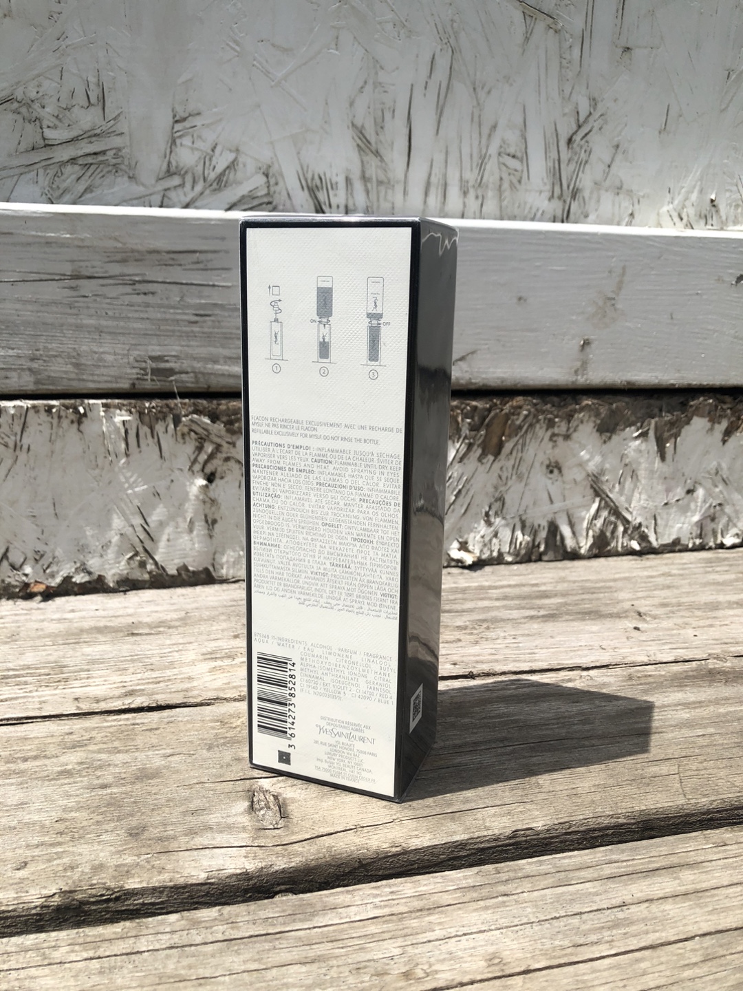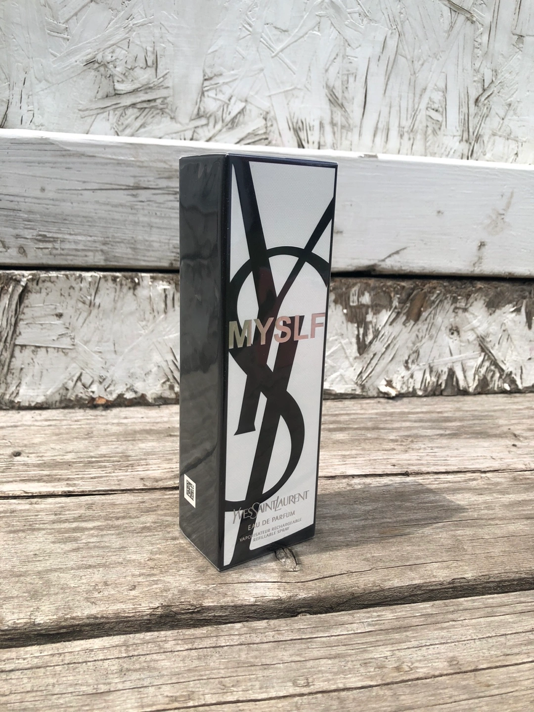 The packaging is a tall, rectangular shape with a sleek design. Features black and white contrasting colors and includes text and graphics. The box is ideal for gifting or storing safely. It’s a real perfume, 1 of 1 Yves Saint Laurent.