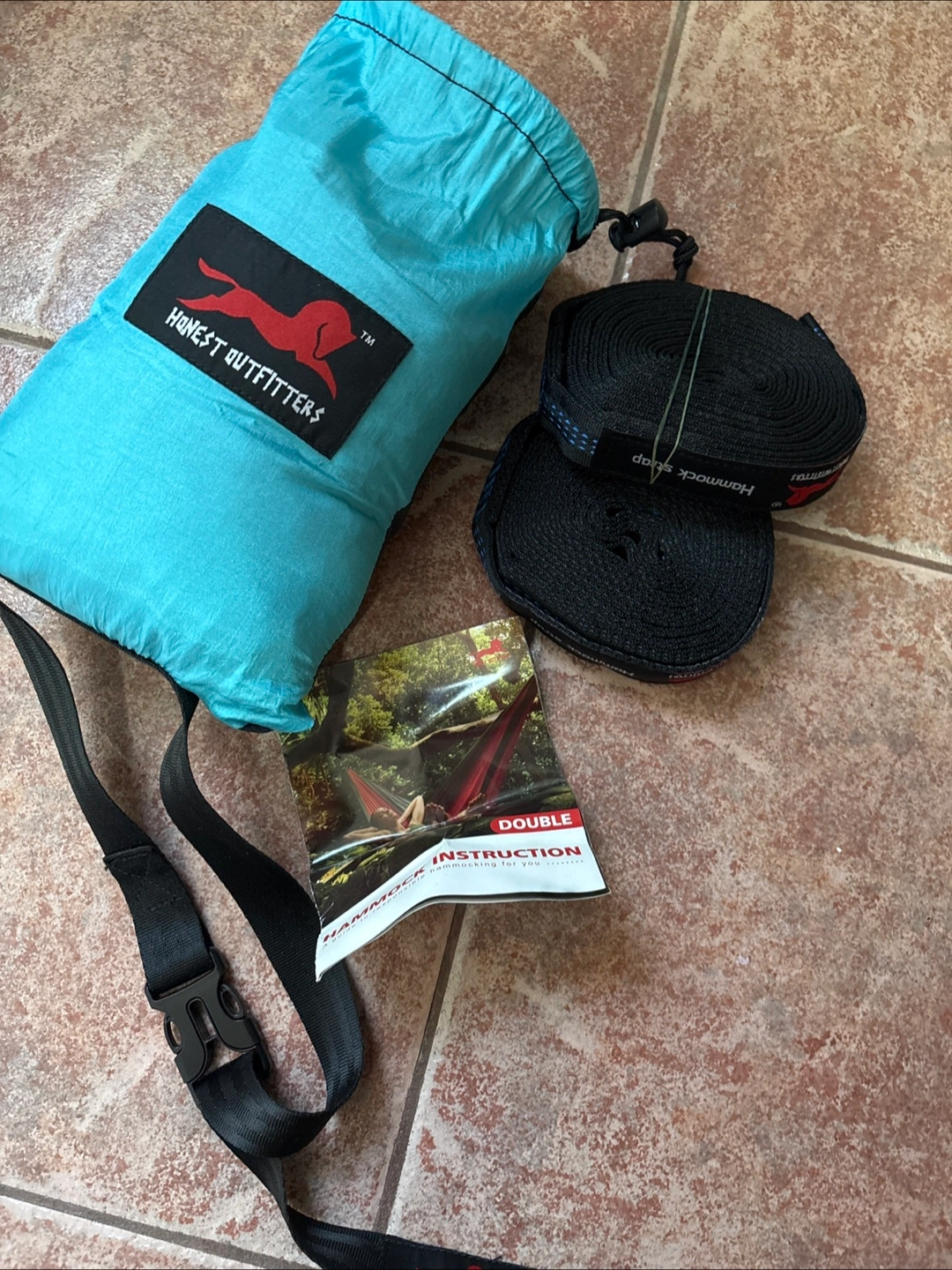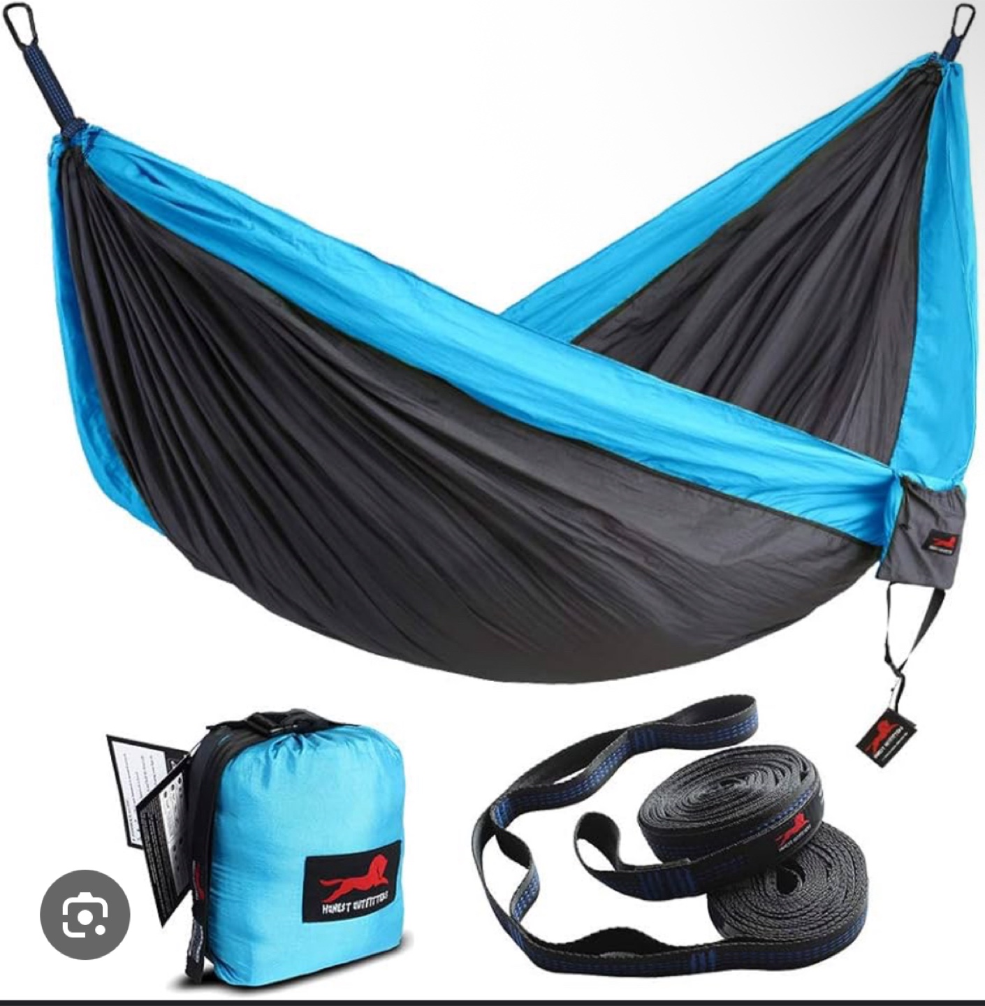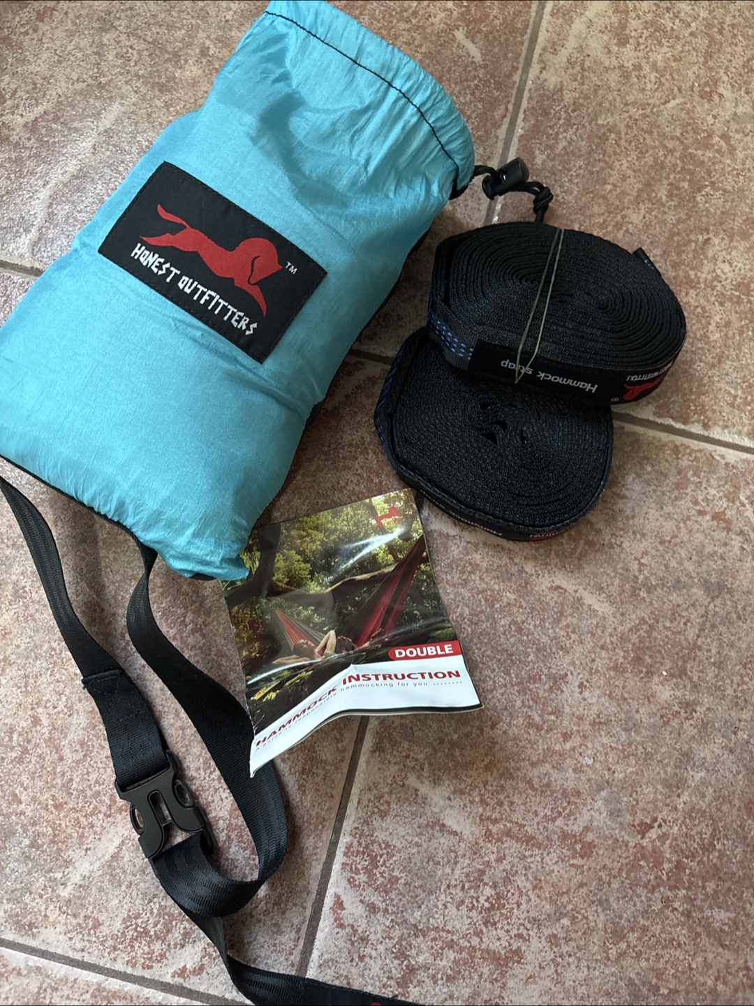 A blue and black hammock, perfect for lounging in the sun. Included are straps, a carrying bag, and instruction manual. Could be used for camping or even just relaxation in your backyard.