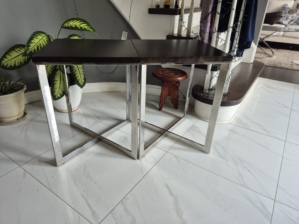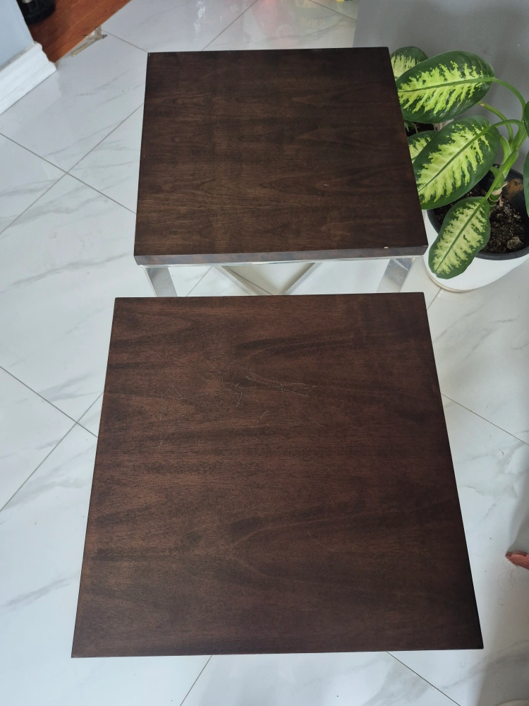 Side tables with a dark wood top and a metallic base. There are scratches visible on the wood surface for one table.