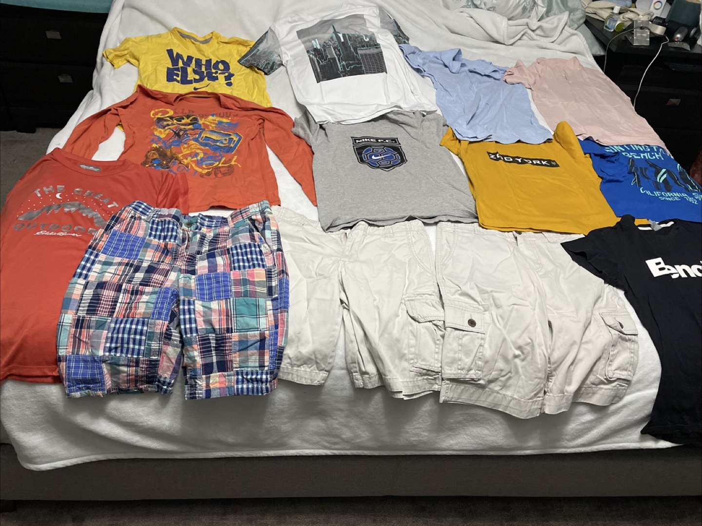 A collection of various shirts and shorts. Several colours and styles are included. Laying down in bed on a lazy day would be ideal for wearing these clothes.