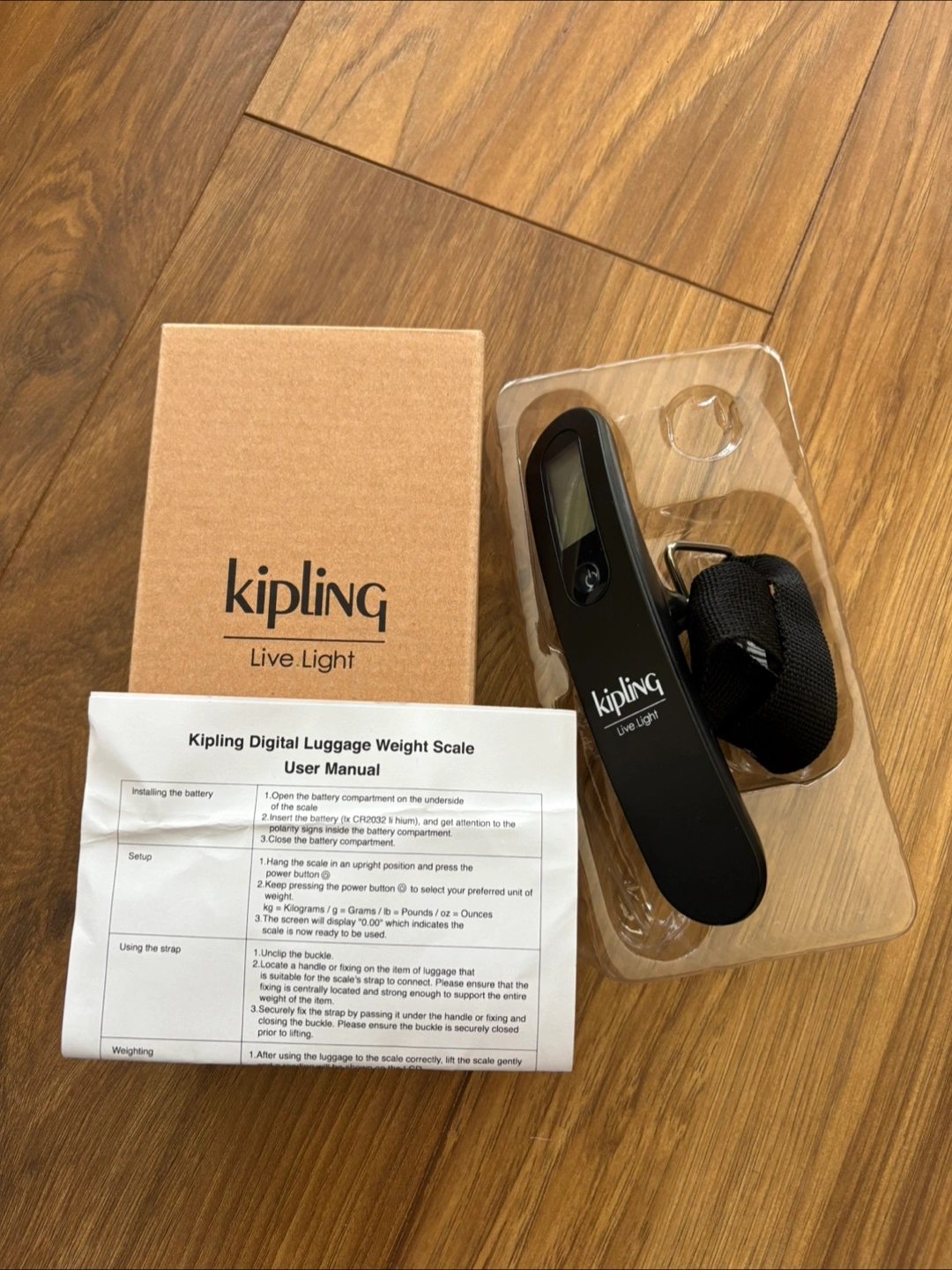 The scale comes with its original packaging and user manual. It features a digital display and a strap for easy attachment. It can help you avoid baggage fees during travel.