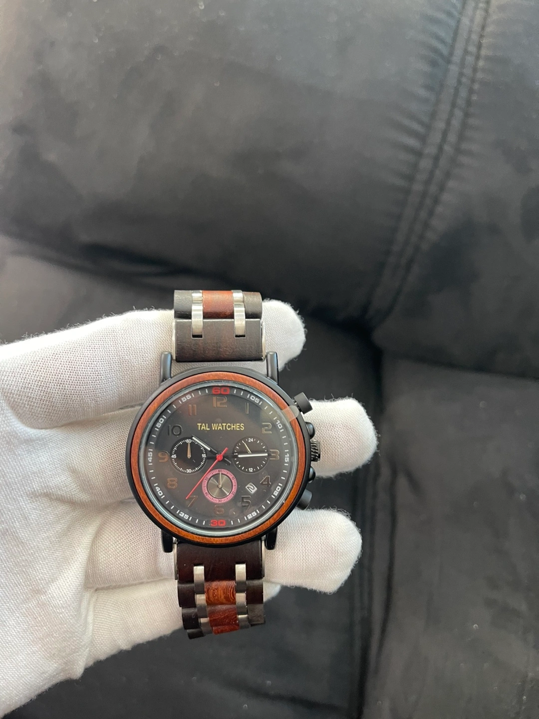 A stylish wooden wristwatch. It features a black watch face with colored detailing. The watch band is a combination of black wood and metal. It is the perfect addition to any outfit, and wearing it might even help you feel more centered.