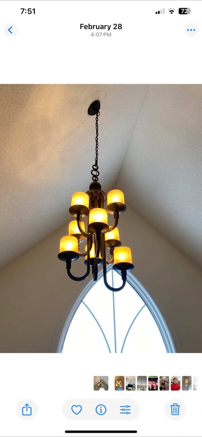 53A vintage chandelier with multiple lights. Featuring curved arms and decorative accents. Will definitely add a touch of elegance to any space, creating a warm and inviting atmosphere.