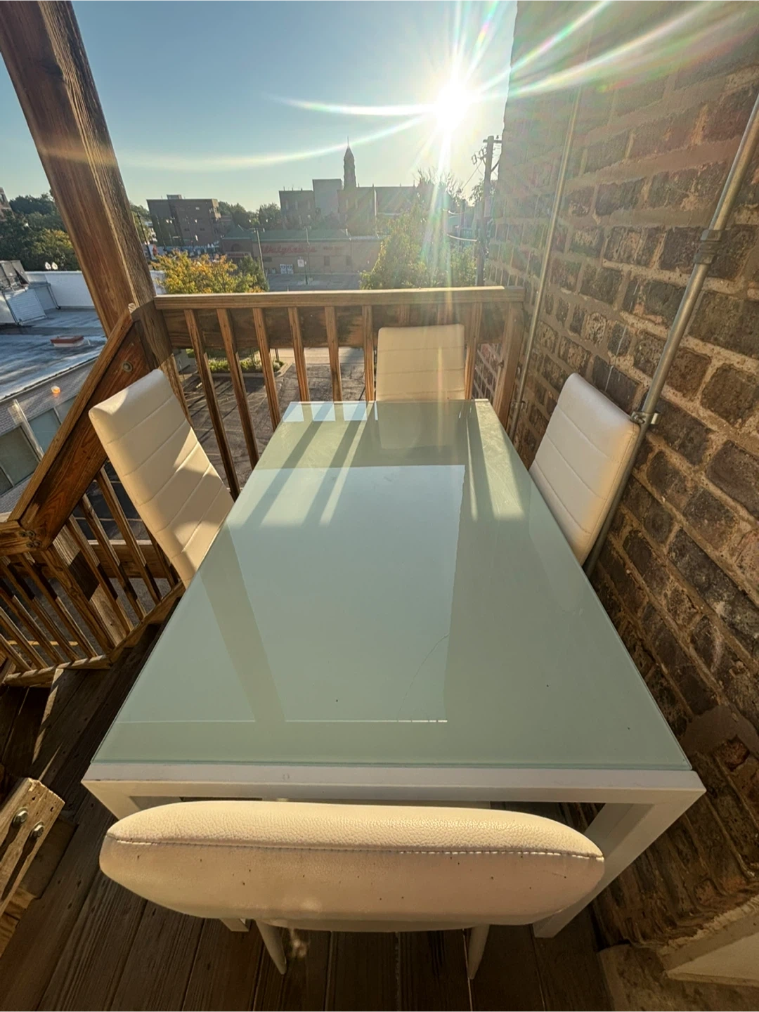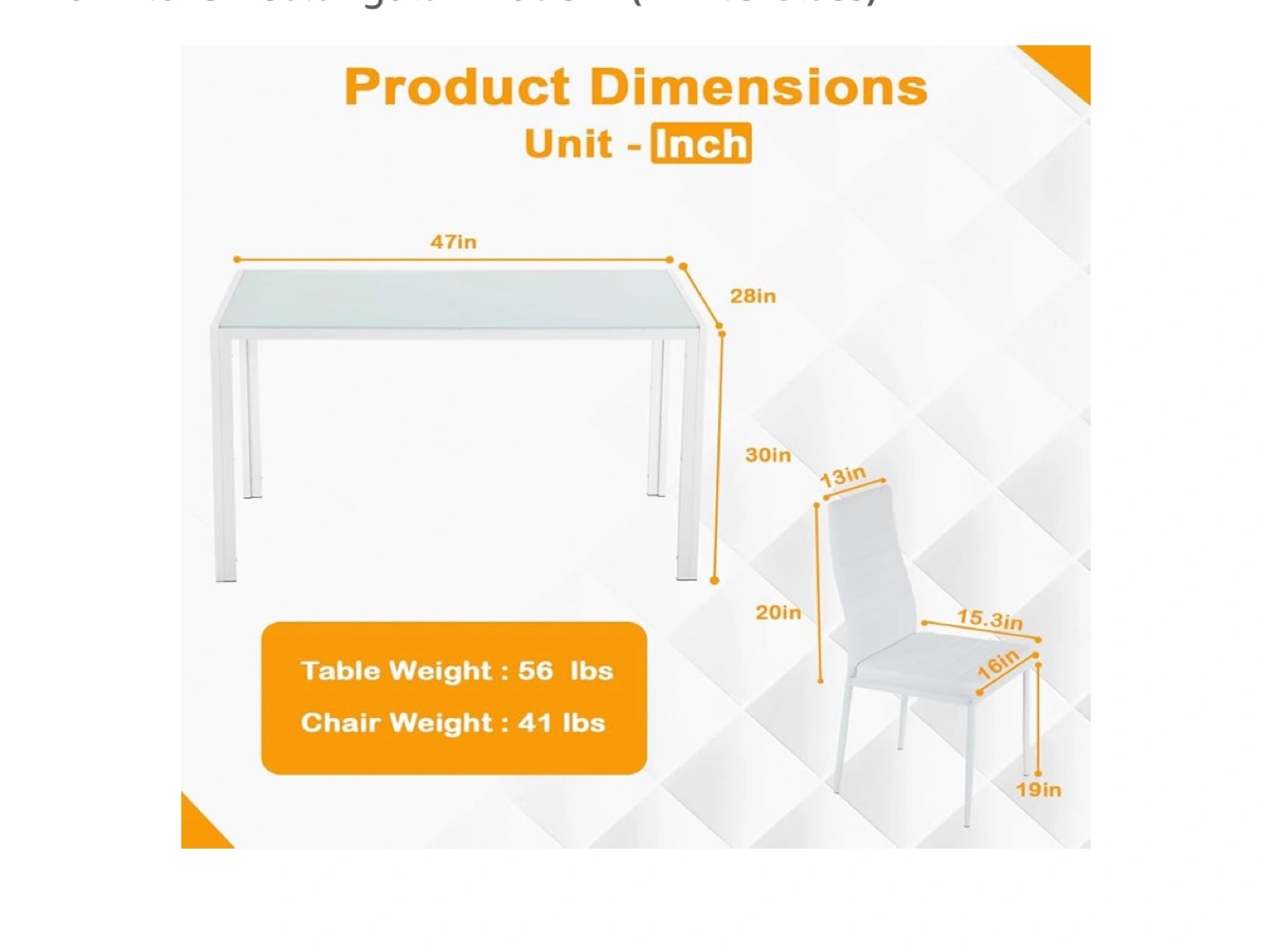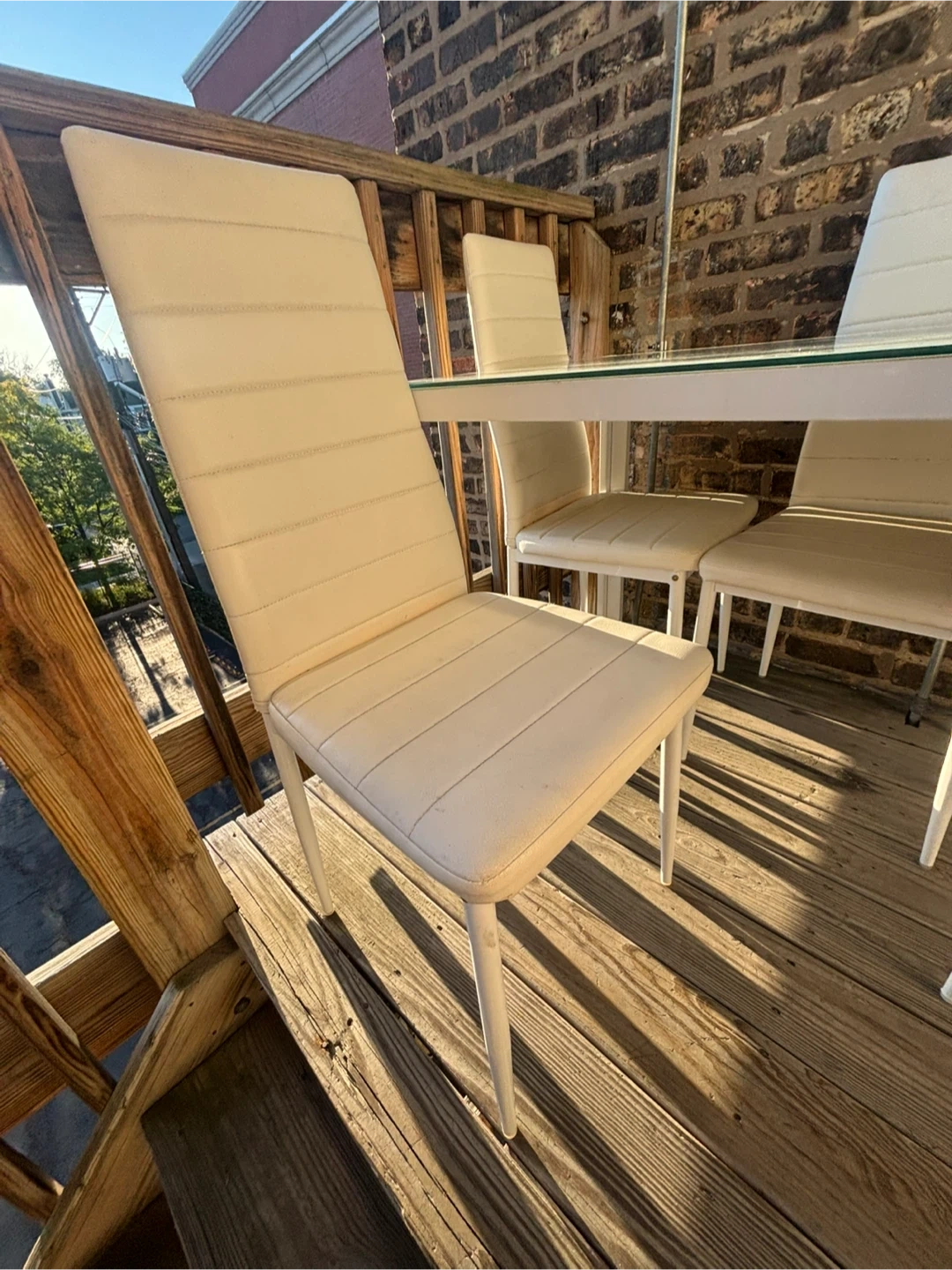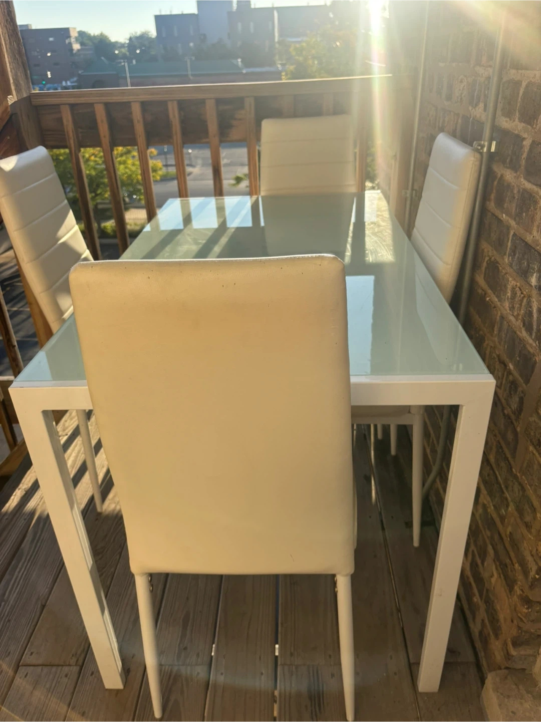 A stylish dining set. Features a rectangular, frosted glass top table. Includes four matching chairs with white metal legs and cream-colored cushions. This set is perfect for a peaceful in and outdoor meal.