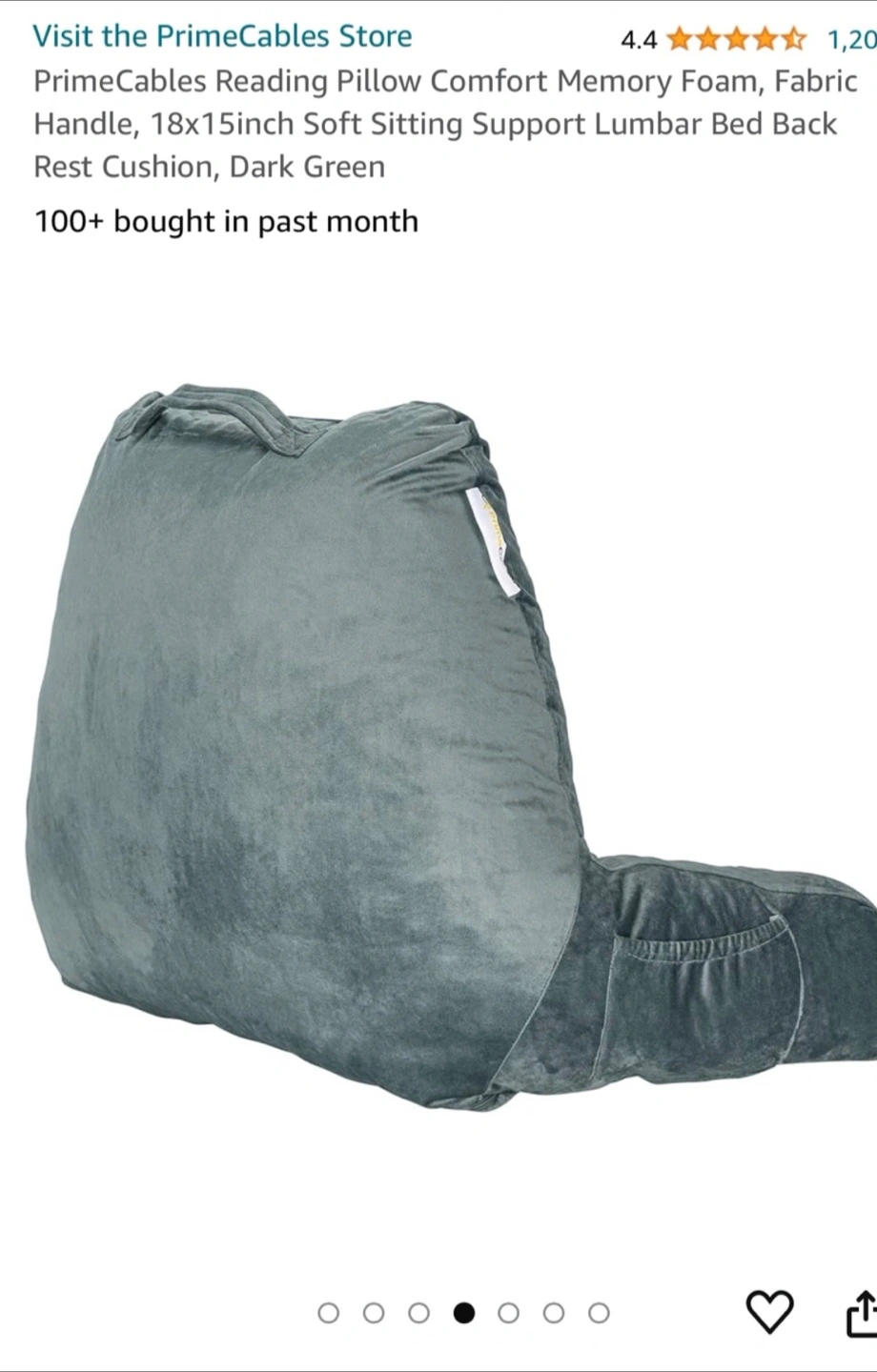 A grey reading pillow. It has armrests and a handle. Great for a cozy afternoon of reading. Barely used. Mom didn’t want it.