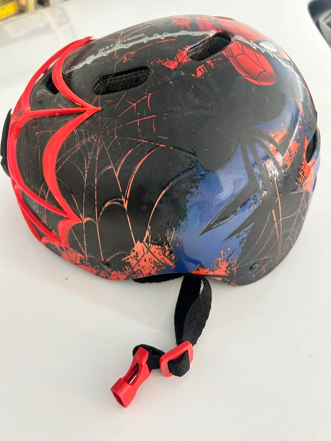 A fun, black helmet, featuring a Spider-Man design. It also includes a strap with a clip. A great helmet for your little one to keep safe while they ride their bike or skateboard.