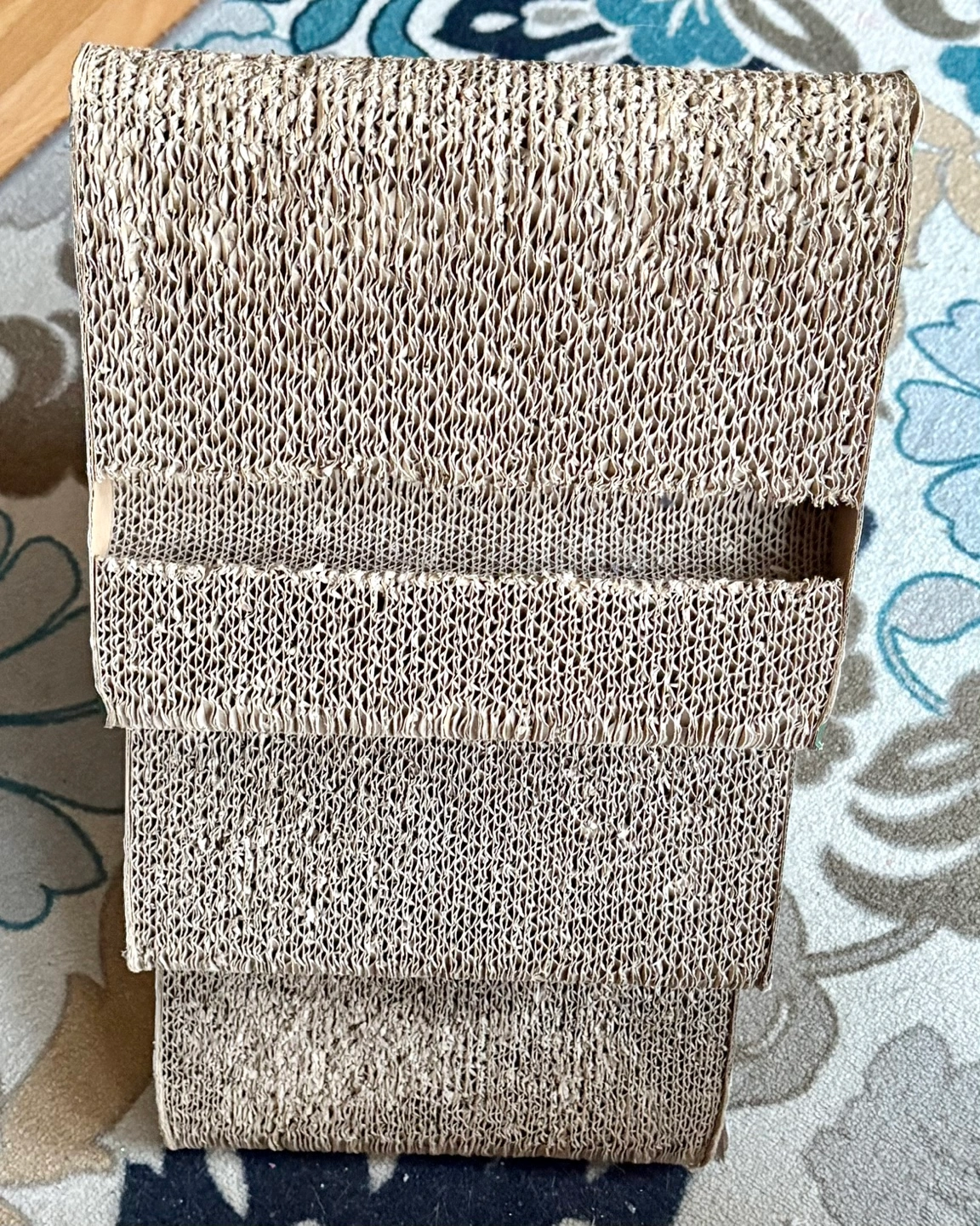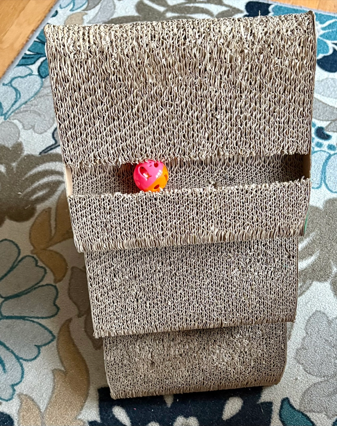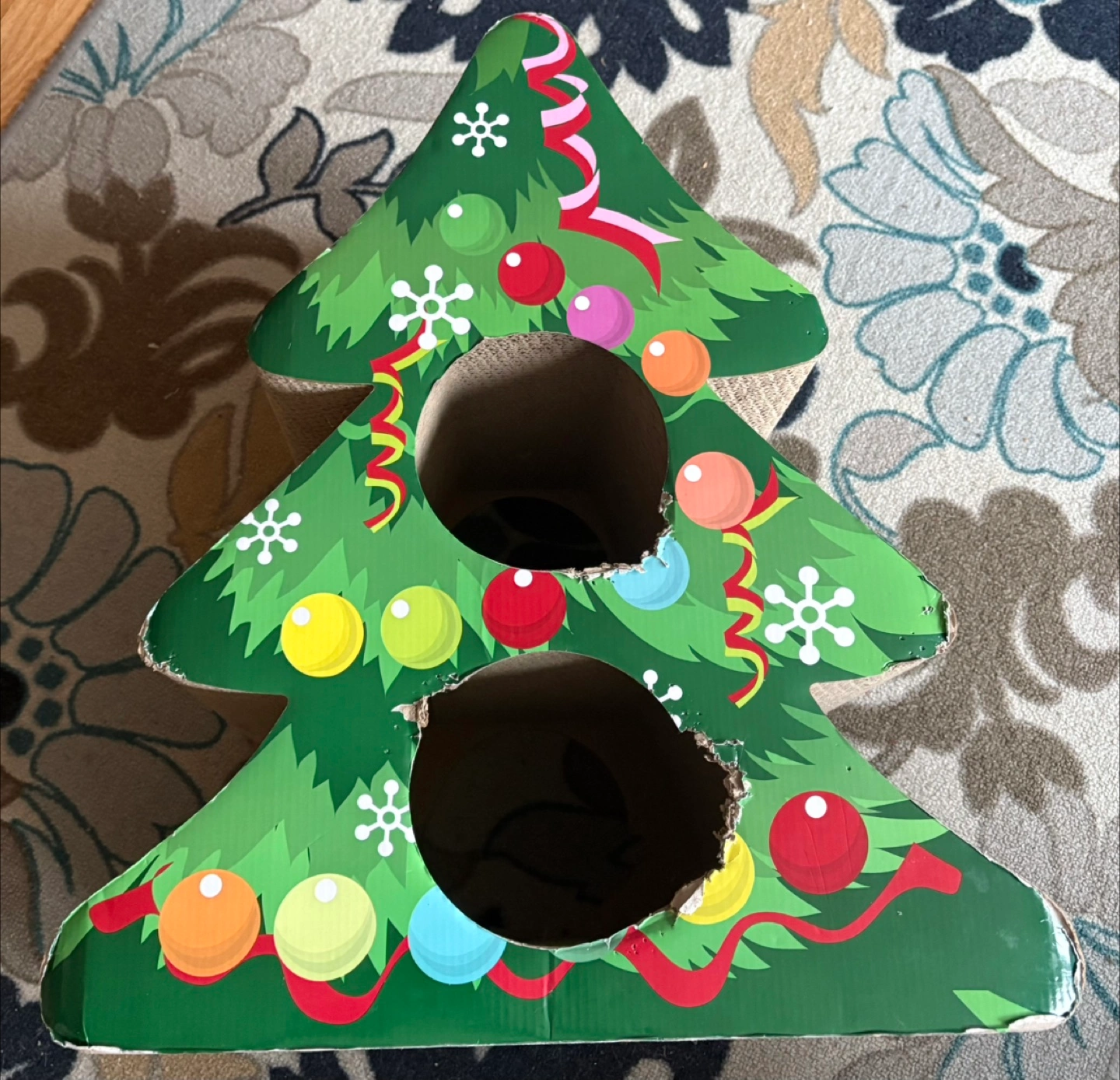 Used Cardboard scratcher shaped like a Christmas tree. Features 2 holes and a ball toy, they can play with. The tree design is decorated with snowflakes, ornaments, and ribbon. Providing a calming space for your cat to play.