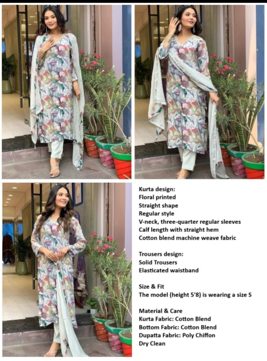 A beautifully designed kurta suit with a delicate floral print. It features a v-neckline with a subtle trim and three-quarter sleeves. Complete with matching trousers, a perfect outfit for a relaxed evening.