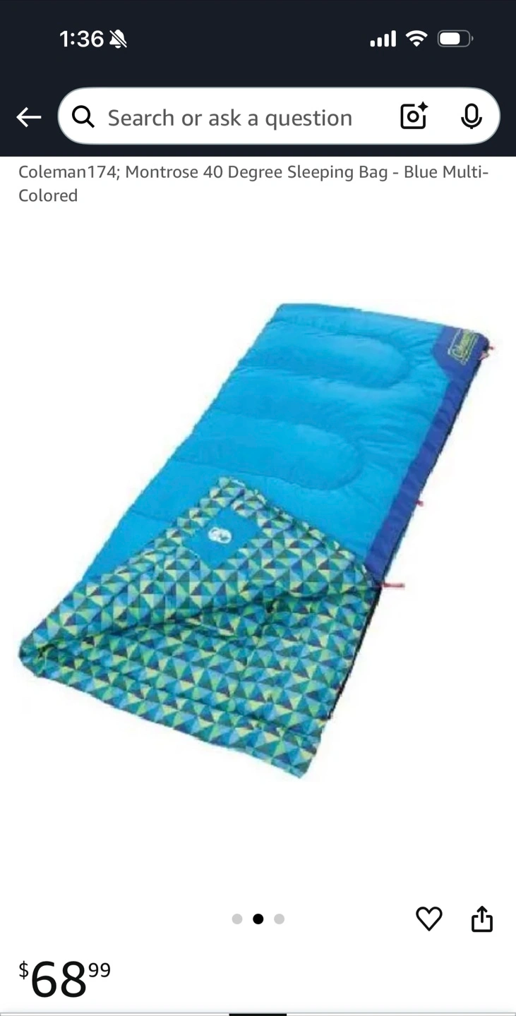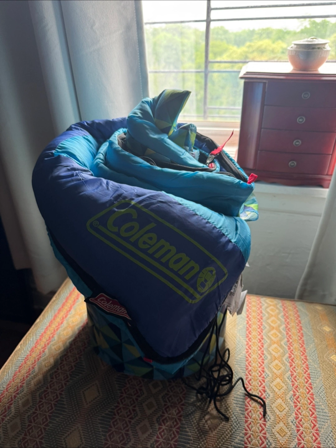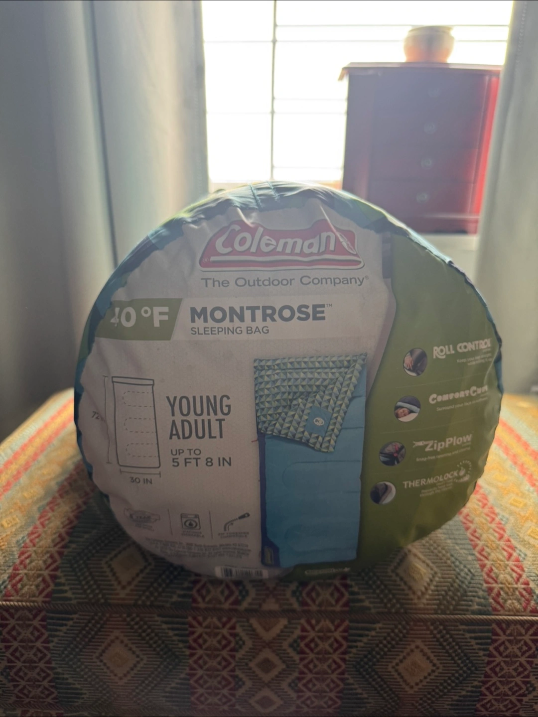 Young adult sleeping bag in shades of blue. Featuring the Coleman brand. Great for those nights under the stars. Open but never used.