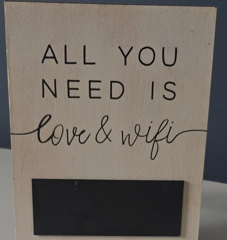 A rectangular wooden sign. Features the phrase: 'All You Need Is Love & Wifi'. Has a small black rectangle chalkboard space at the bottom to write your favorite quote. A great decoration for any home to spread a positive message.