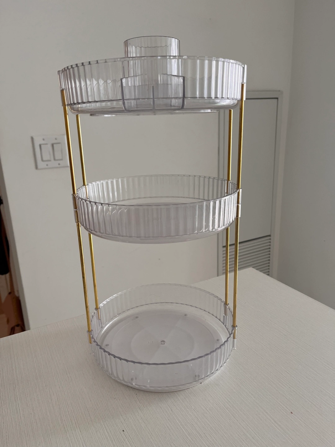 A 3-tier display tray with gold-toned metal supports and clear plastic trays. The trays have a ribbed design. Use it to hold snacks or display your favourite small items for a relaxing moment.
