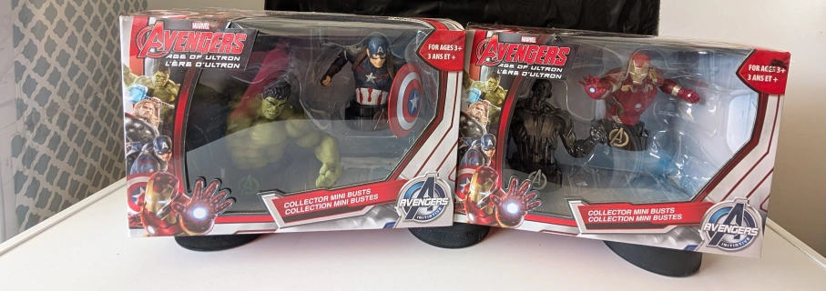 These collector mini busts feature various characters from the Avengers. Included are busts of the Hulk, Captain America, Iron Man, and Ultron. They are in their original packaging. Displaying them would be a nice addition to any collection, making you feel relaxed and content. $10 each