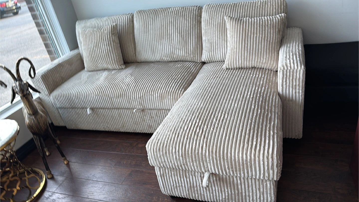 Sofa in a neutral colour. Sectional design for a spacious living space. Features a corduroy-like texture. You could definitely enjoy a cozy afternoon nap on it.