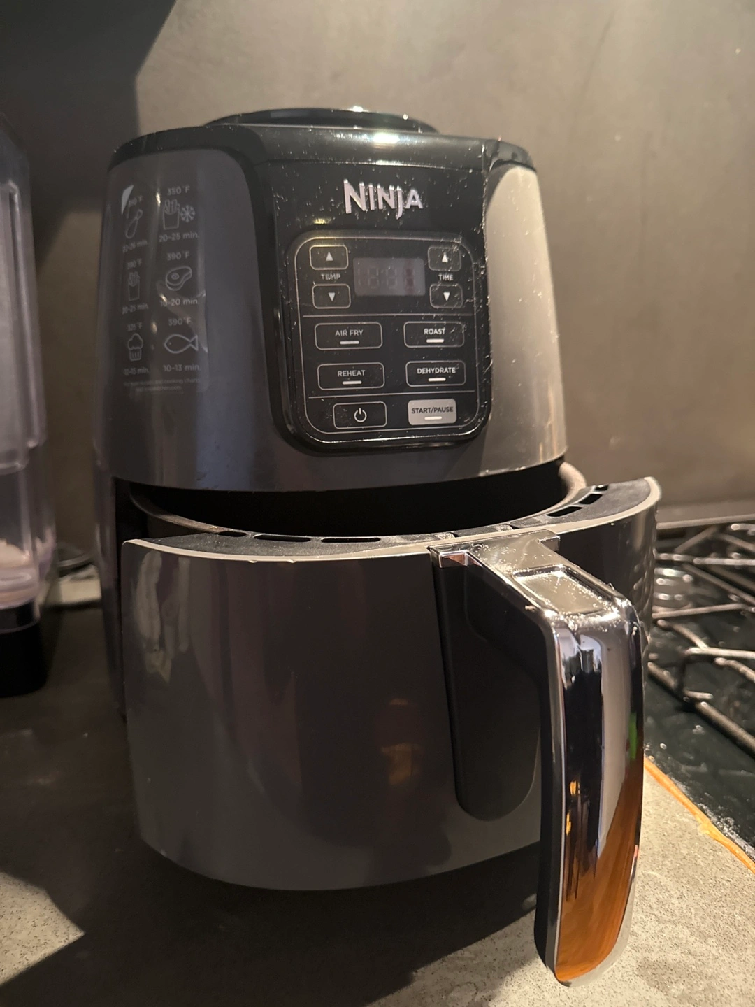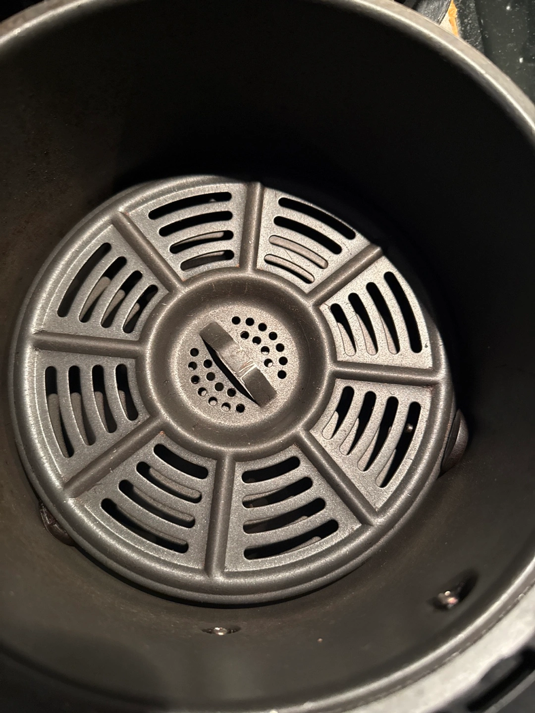 Air fryer, perfect for creating quick and easy meals. Has an interesting, round, perforated grate on the inside. Features a digital display with buttons for different functions. Enjoy a relaxing meal in the comfort of your home.
