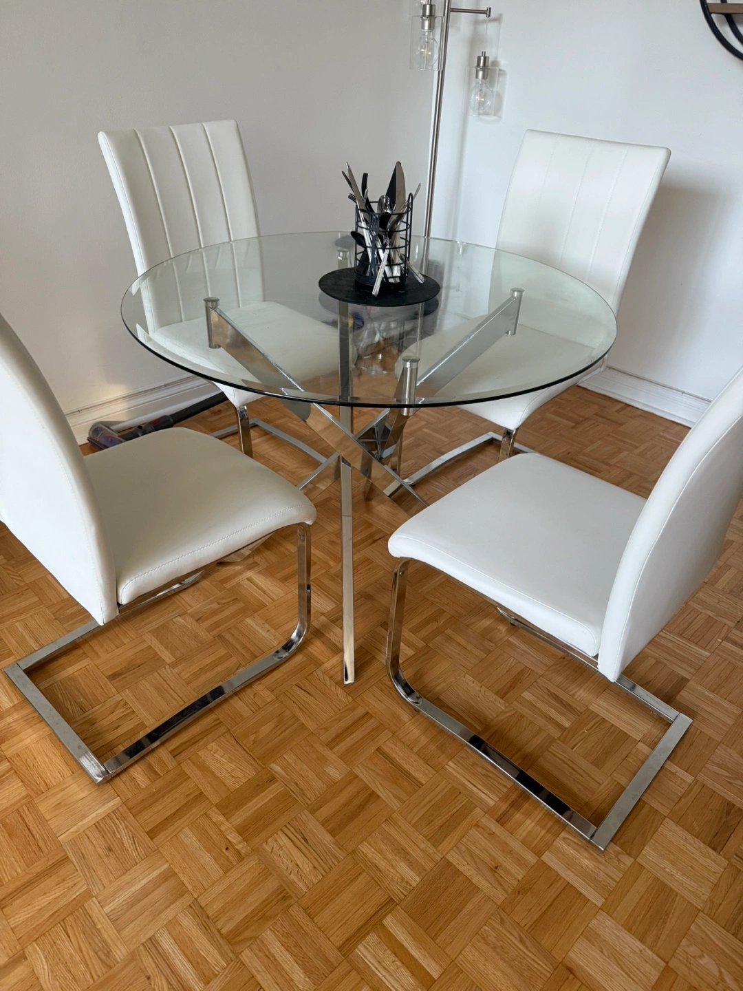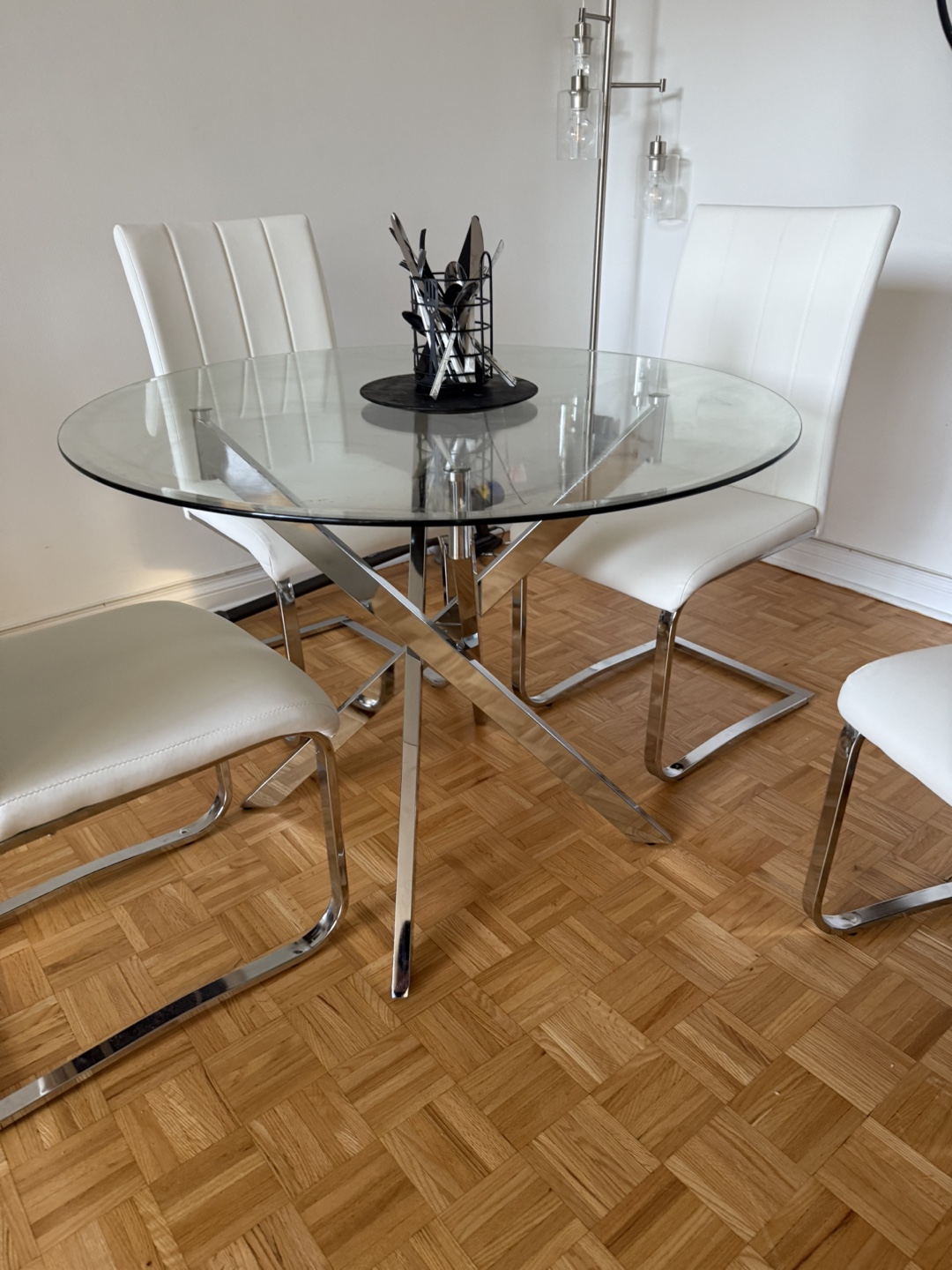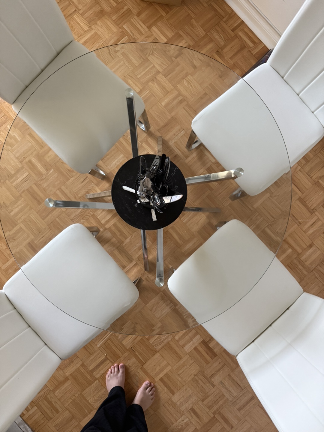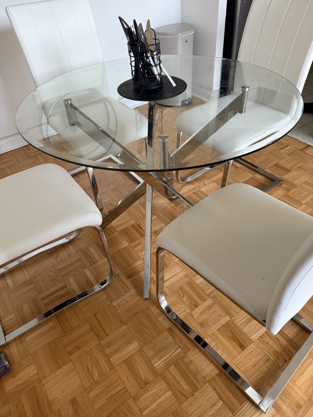 • Round glass tabletop (no chips, scratches, or cracks)