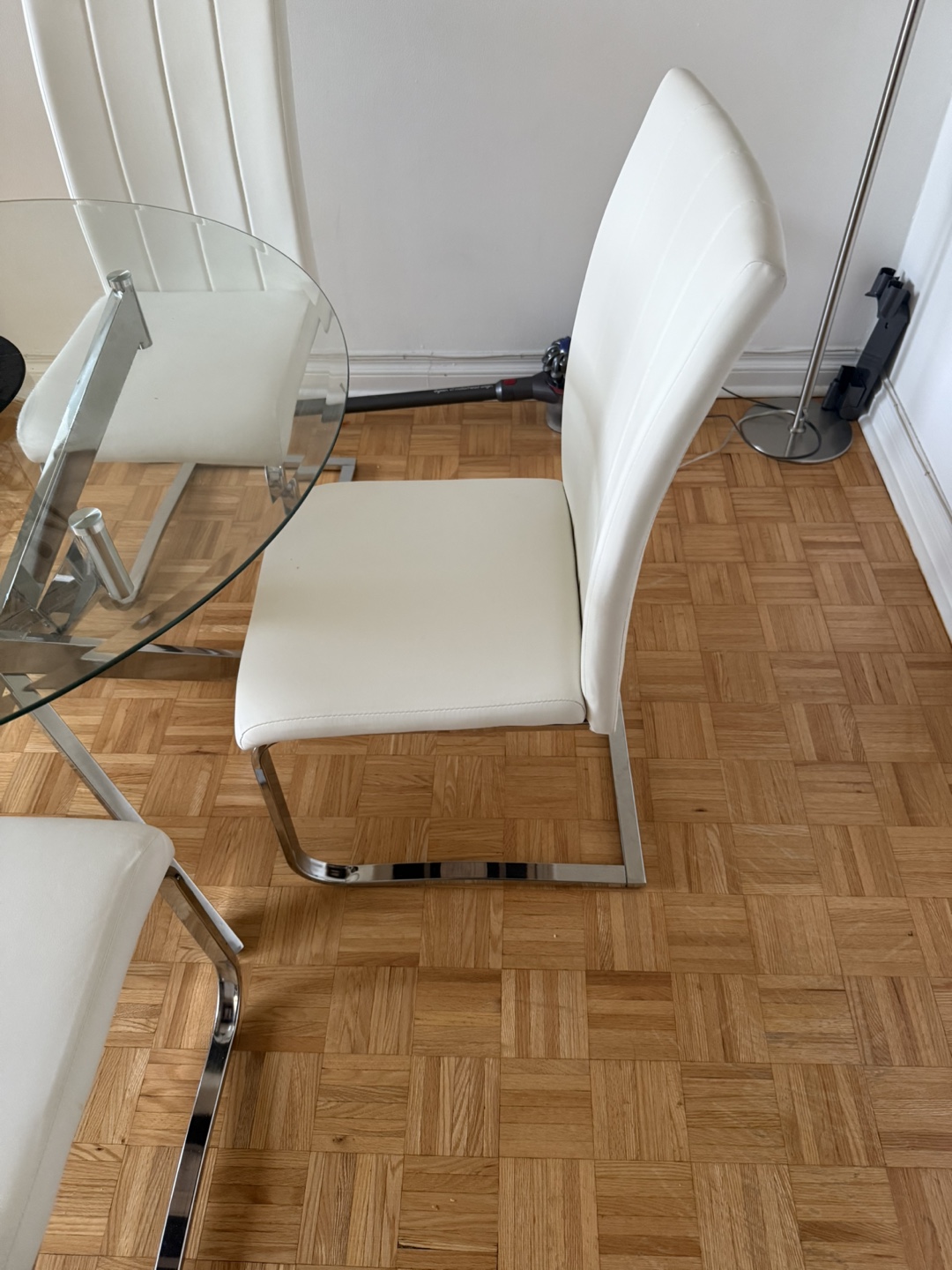 • 4 white faux leather chairs with chrome cantilever legs