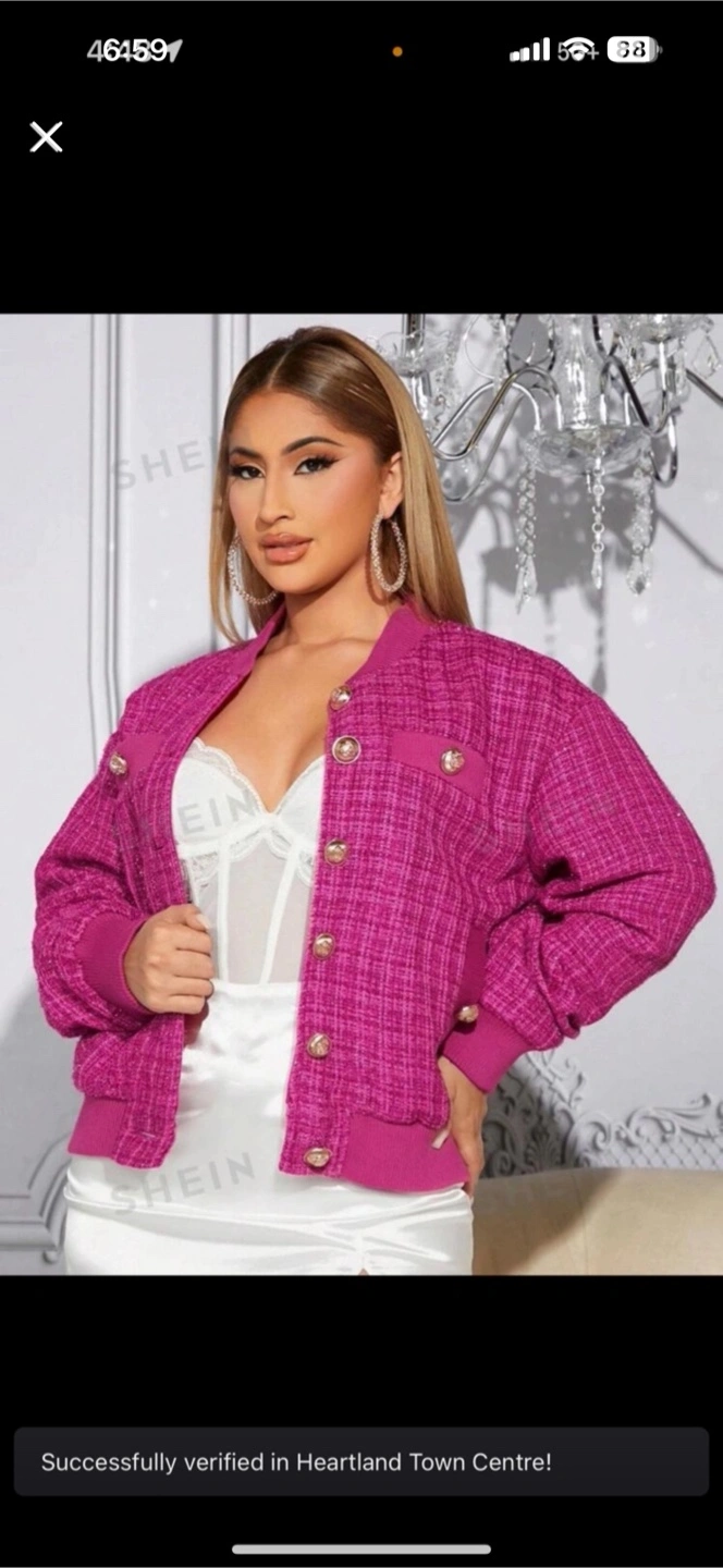 A pink tweed jacket with gold-coloured buttons. It has a round neckline. The sleeves end with cuffs. This jacket would look perfect over a dress.
