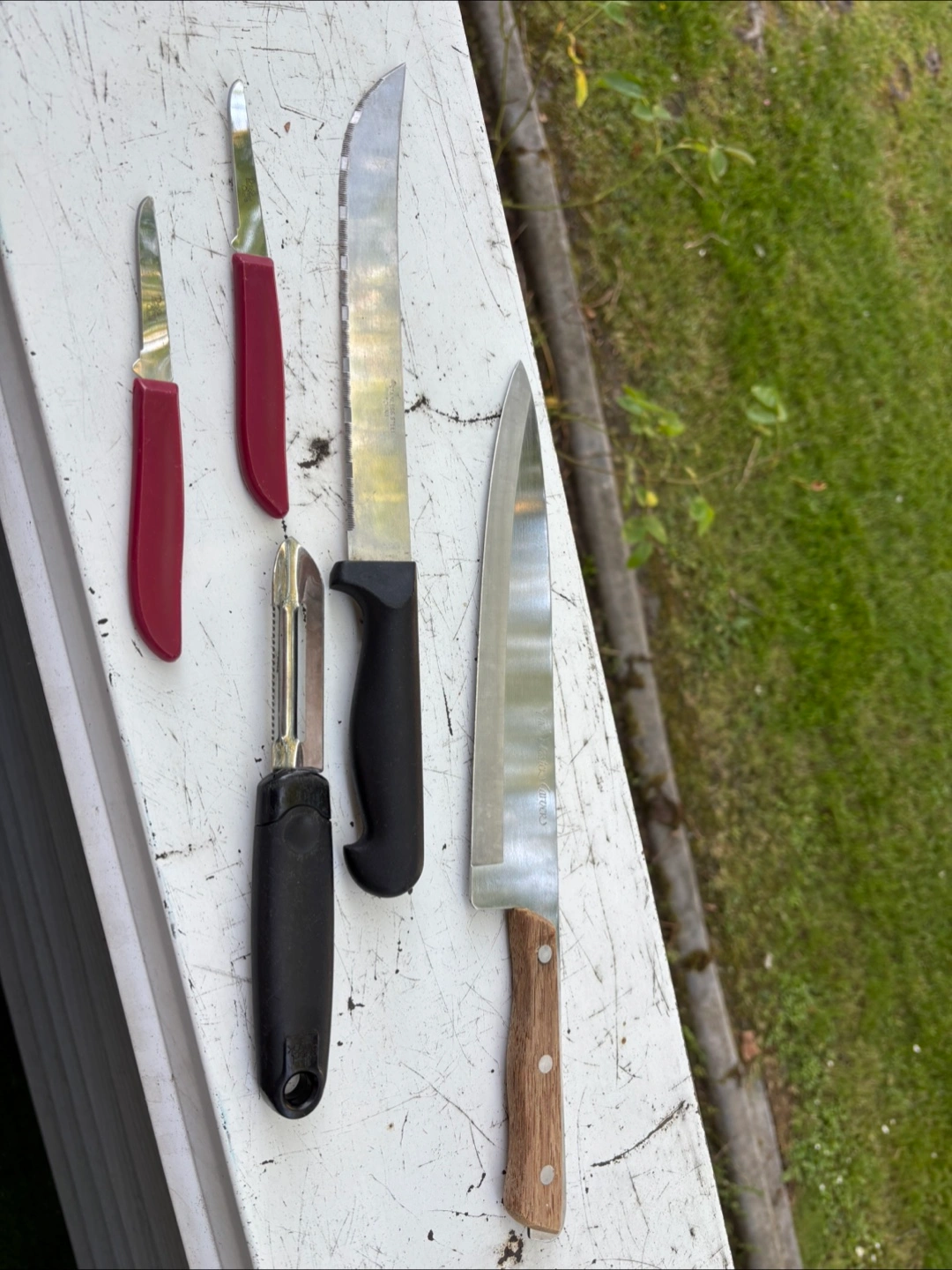 A selection of knives. Various sizes. Some with red handles, some with black handles and wooden handle. A useful set for any kitchen setup, allowing you to enjoy the process of cooking.